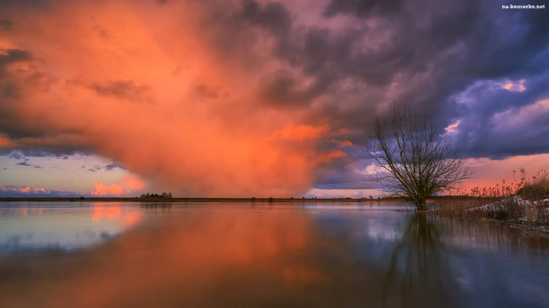 Szuwary, Jezioro, Drzewo, Chmury, Niebo, Kolorowe na Komórkę