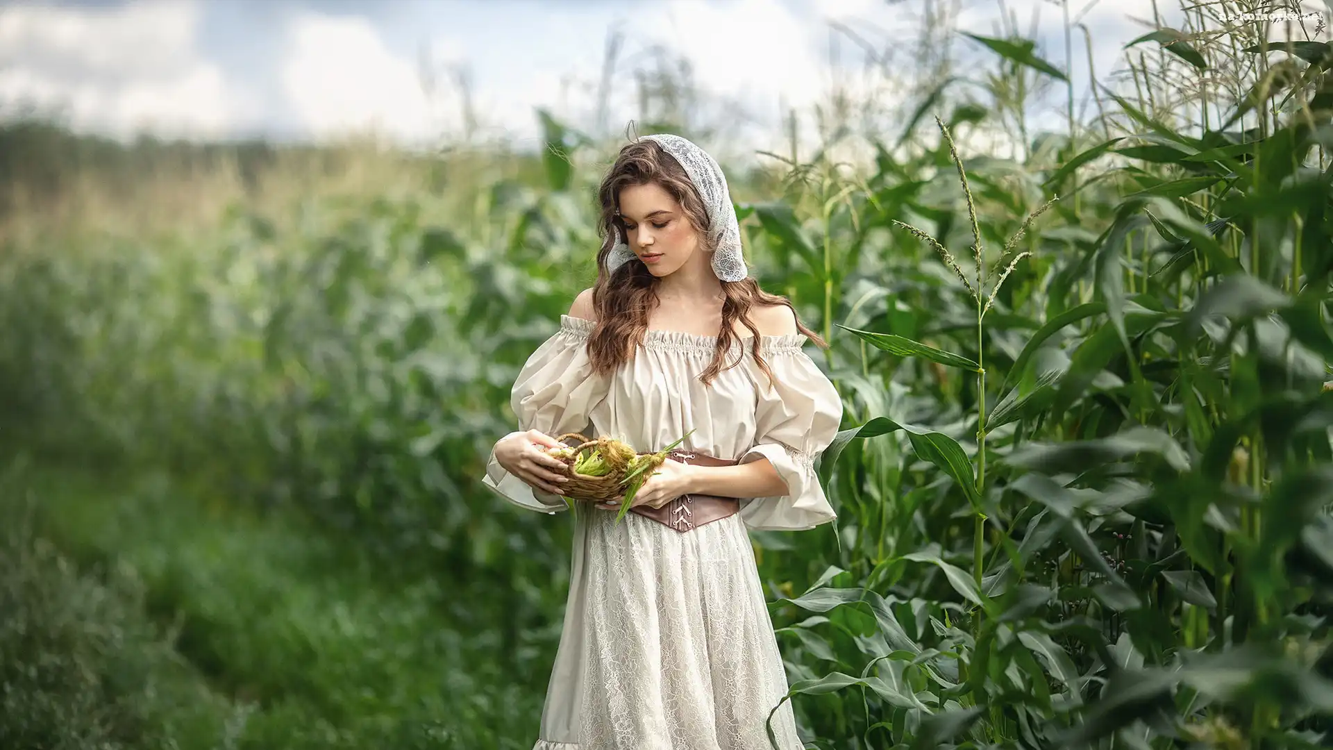 Dziewczyna, Chustka, Koszyczek, Sukienka, Kukurydza na Komórkę