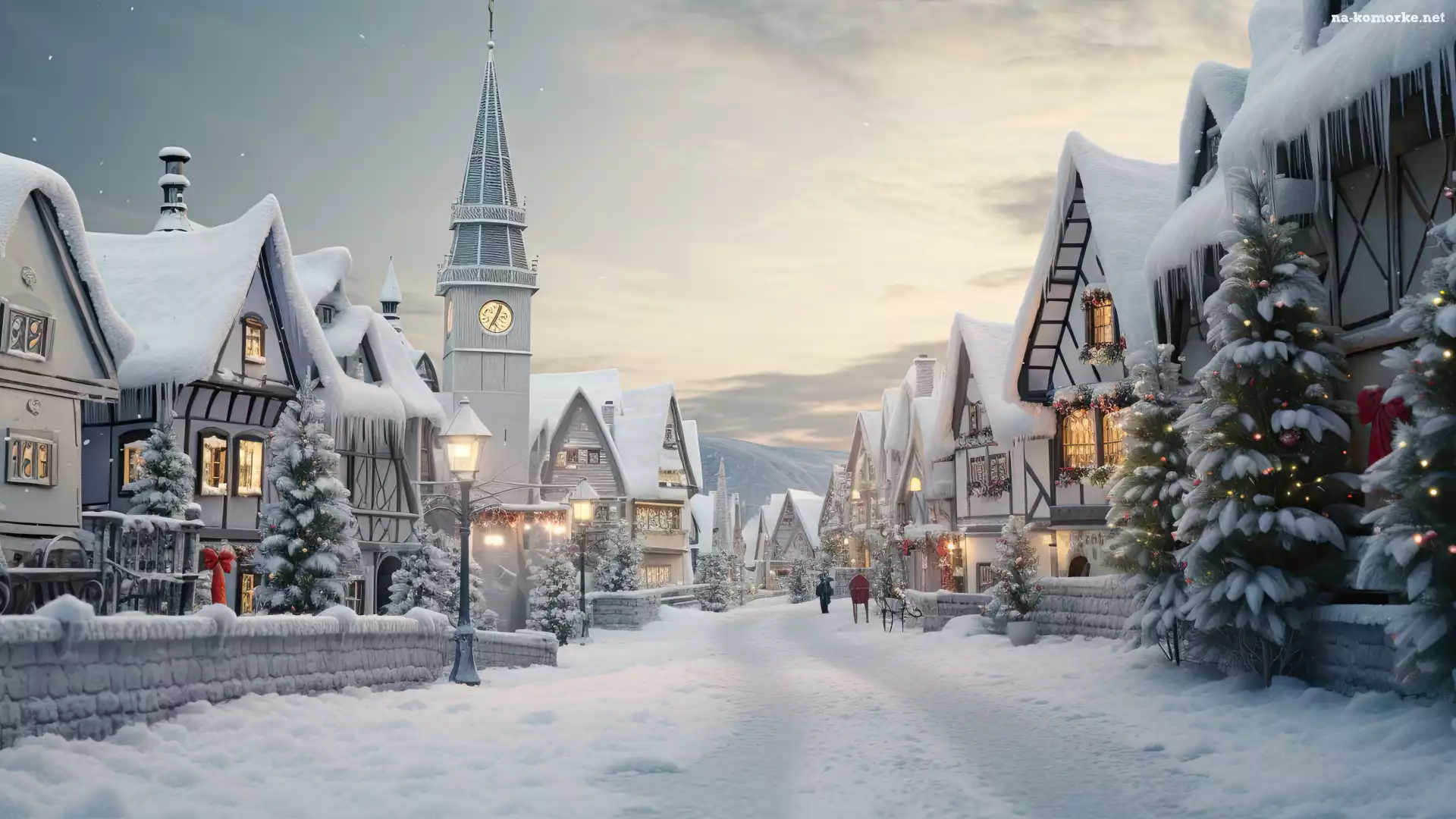 Wieża, Zima, Śnieg, 2D, Ulica, Domy na Komórkę