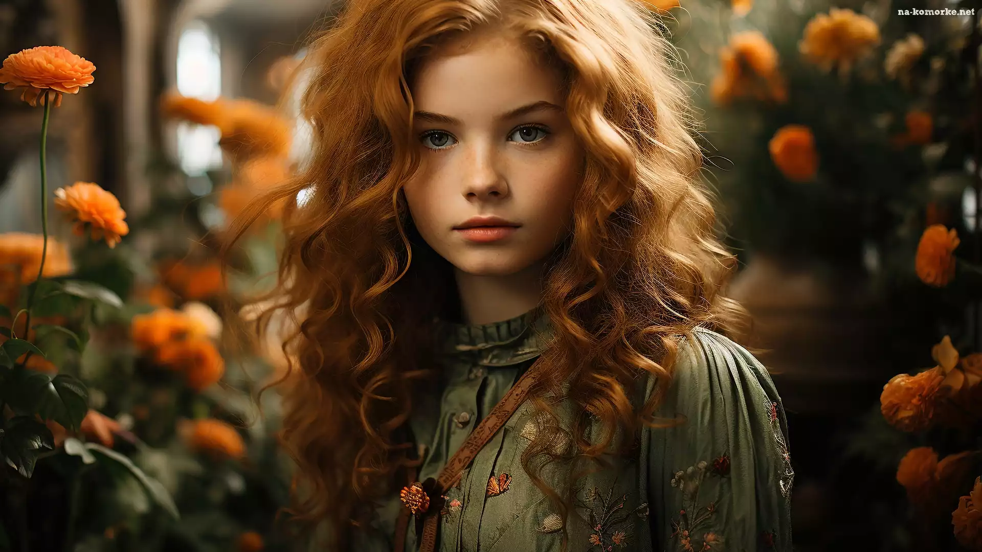 Bluzka, Kwiaty, Dziewczyna, 2D, Piegi, Zielona, Rudowłosa na Komórkę