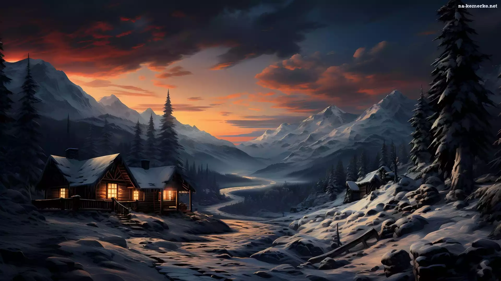 Zima, Wieczór, Góry, 2D, Rzeka, Strumień, Dom na Komórkę