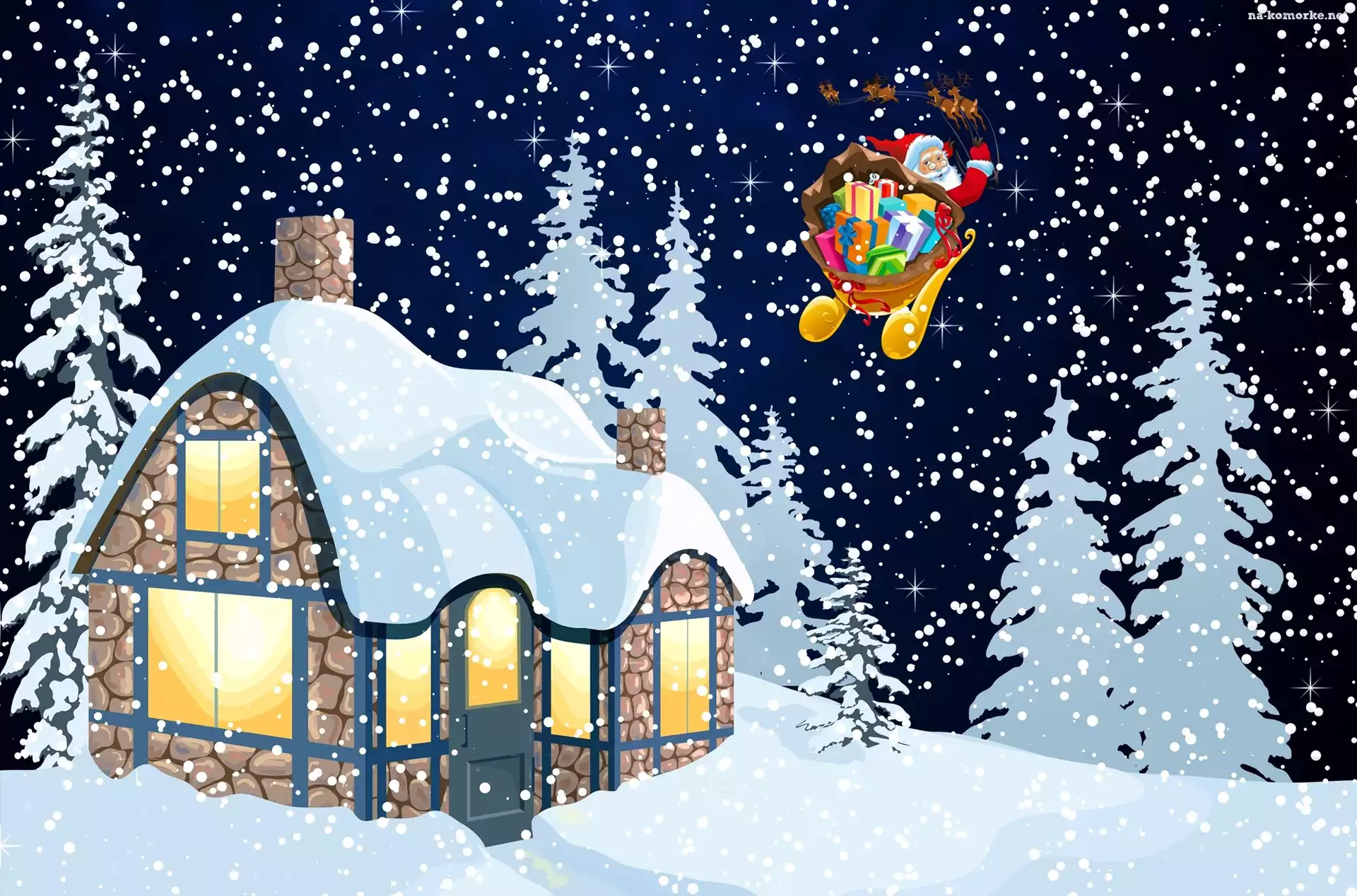 Grafika 2D, Drzewa, Zima, Domek, Sanie, Mikołaj, Renifery na Komórkę