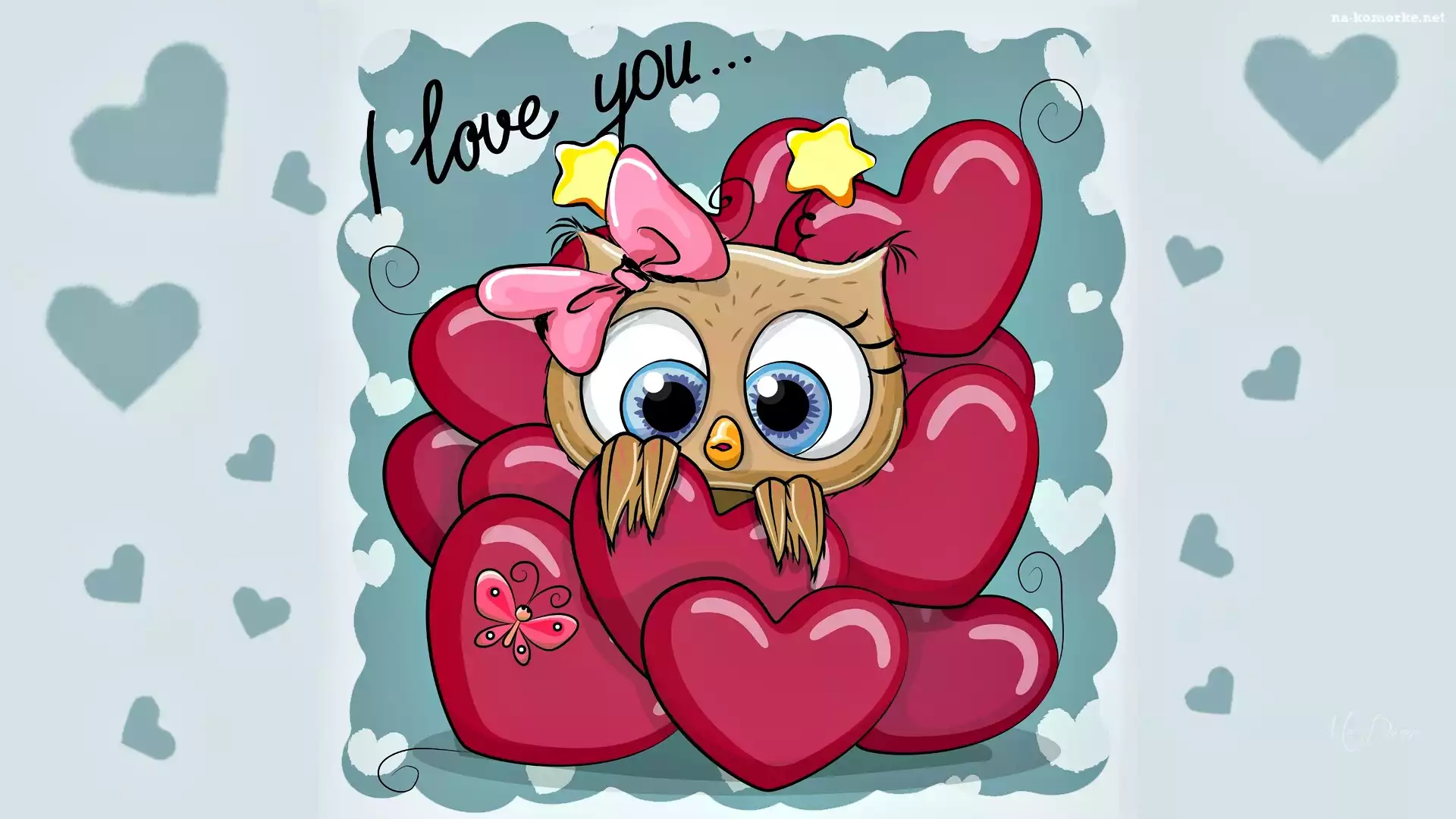 Grafika 2D, Sówka, Serca, Napis, I love you na Komórkę