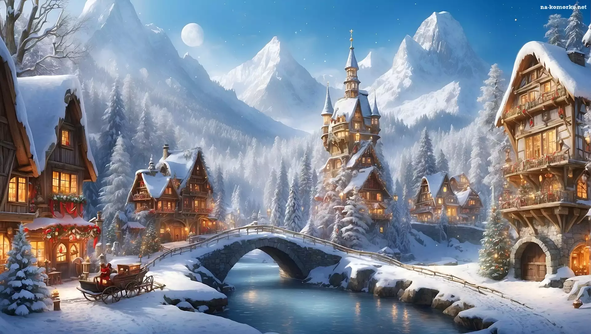 Domy, Góry, Zima, 2D, Zamek, Most, Bajkowy na Komórkę