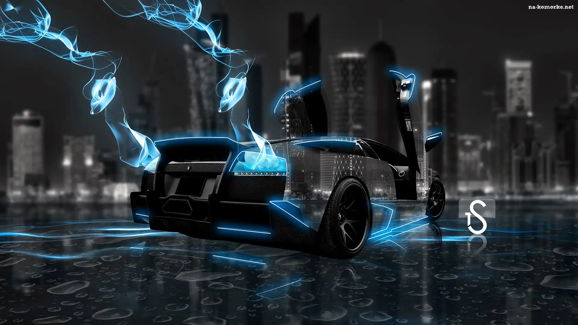 Grafika, Czarny, Lamborghini Murcielago, Noc, Miasto na Komórkę