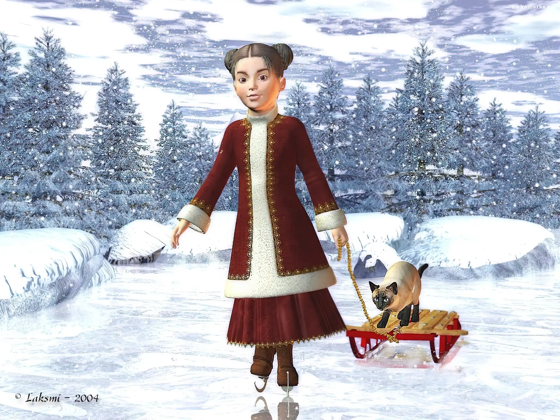 3D, Zima, Dziewczynka, Sanki, Kot na Komórkę