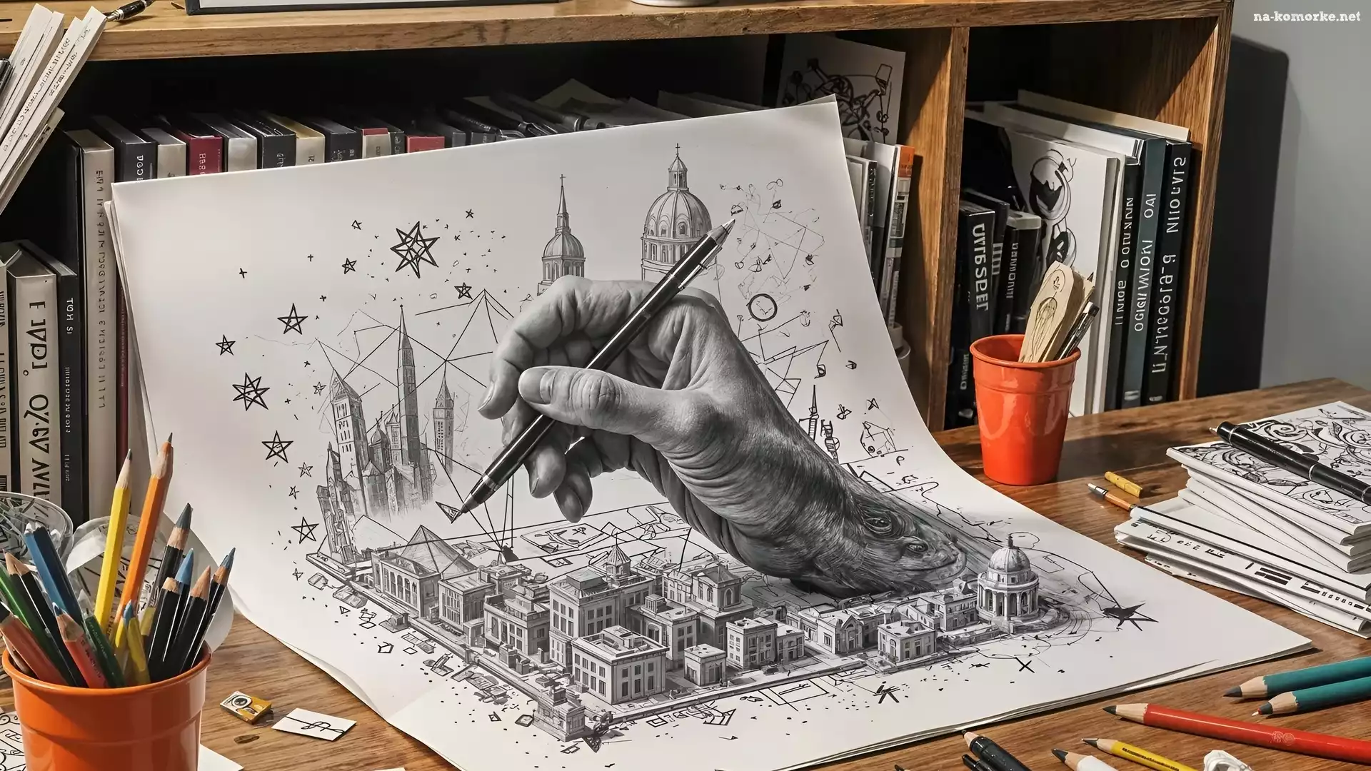 Książki, Regał, Rysunek, 4D, Kredki, Ołówki, Ręka na Komórkę