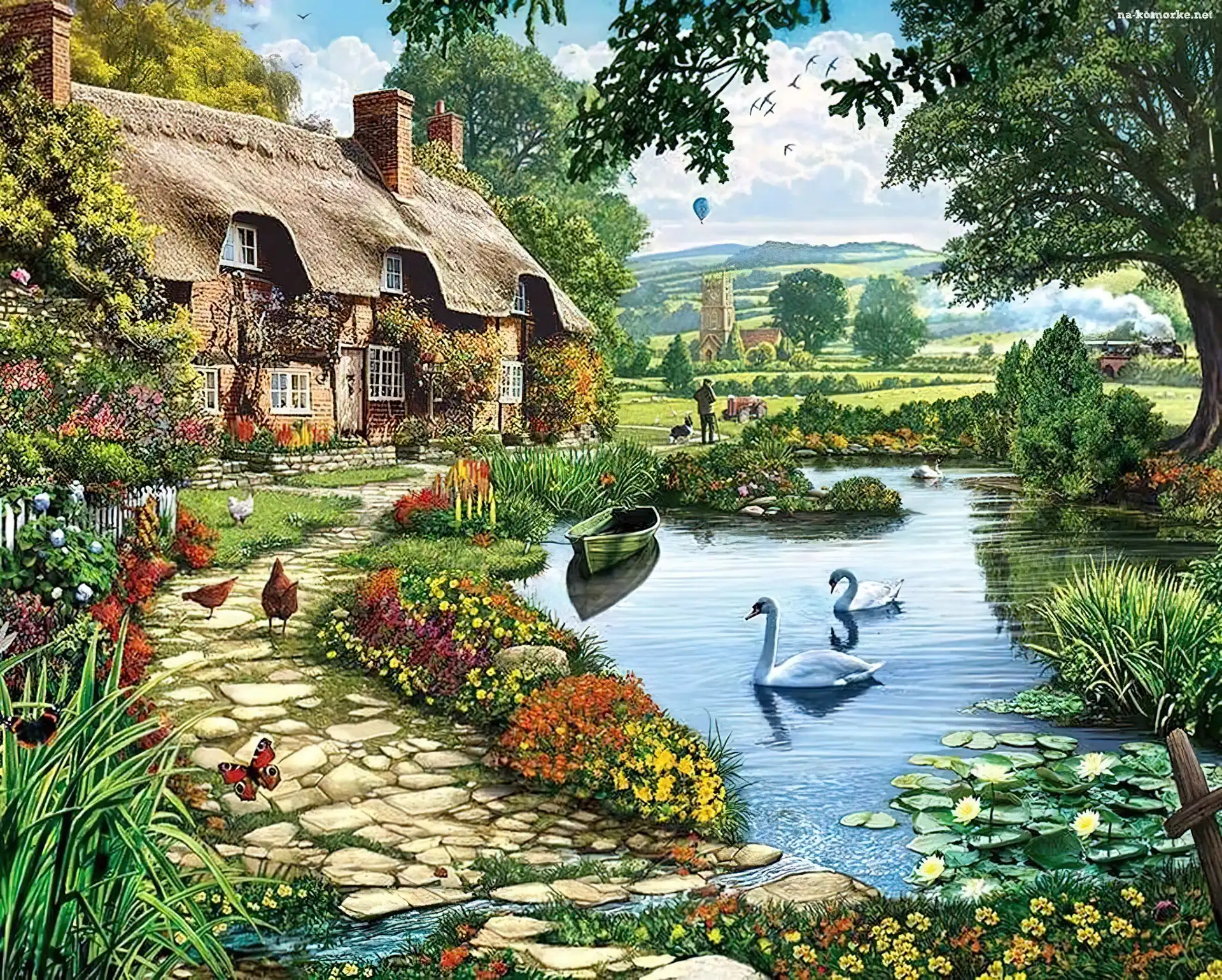 Łabędzie, Dróżka, Dom, Reprodukcje Obrazów, Staw, Kury na Komórkę