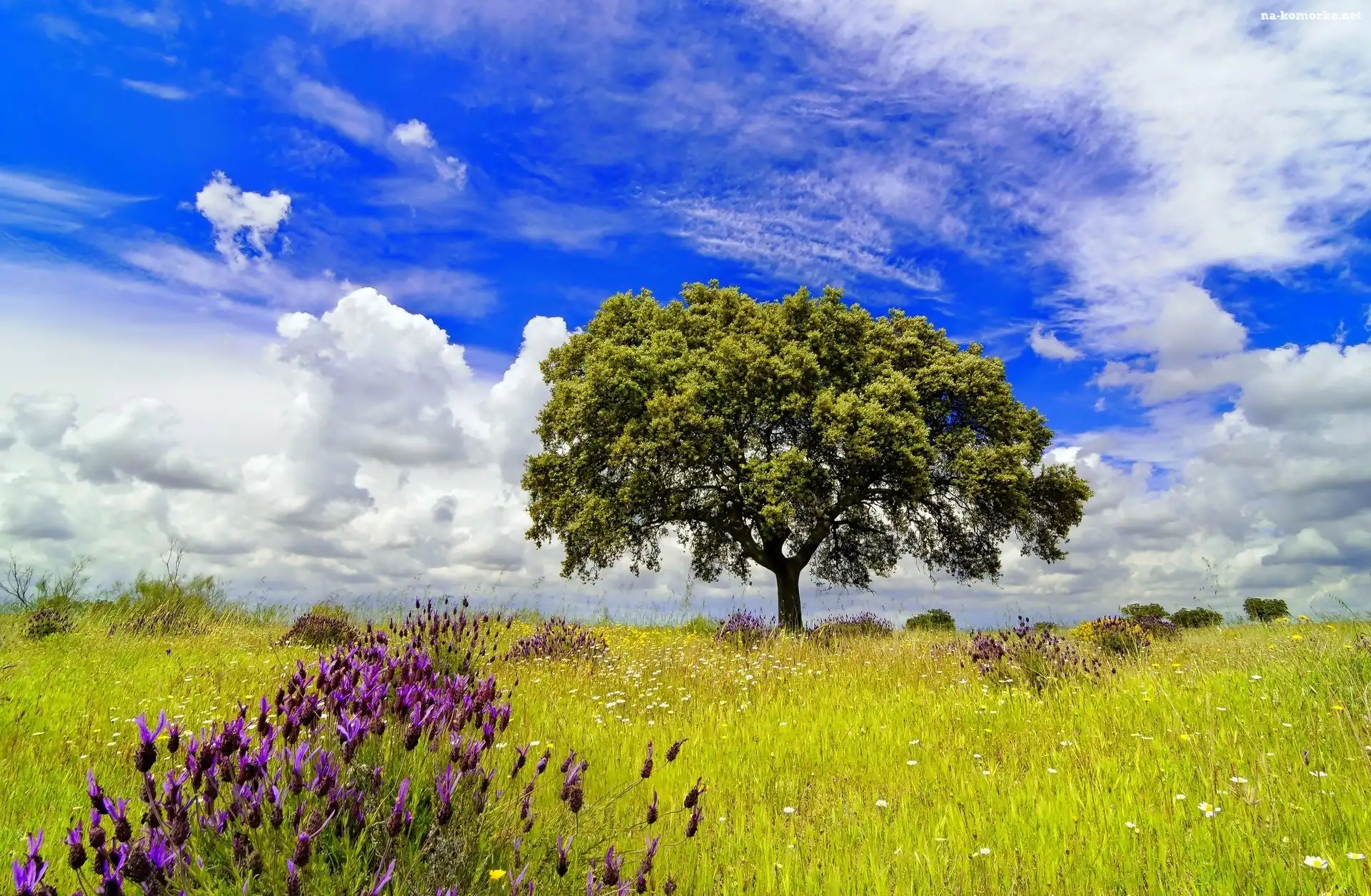 Łące, Drzewo, Samotne, Chmury, Na, Kwiatki na Komórkę