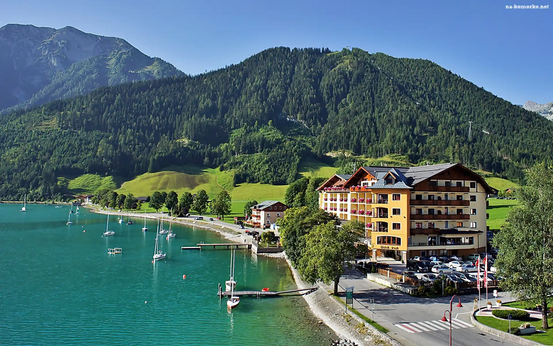 Tyrol, Achensee, Lasy, Jachty, Góry, Pertisau, Hotel, Jezioro na Komórkę