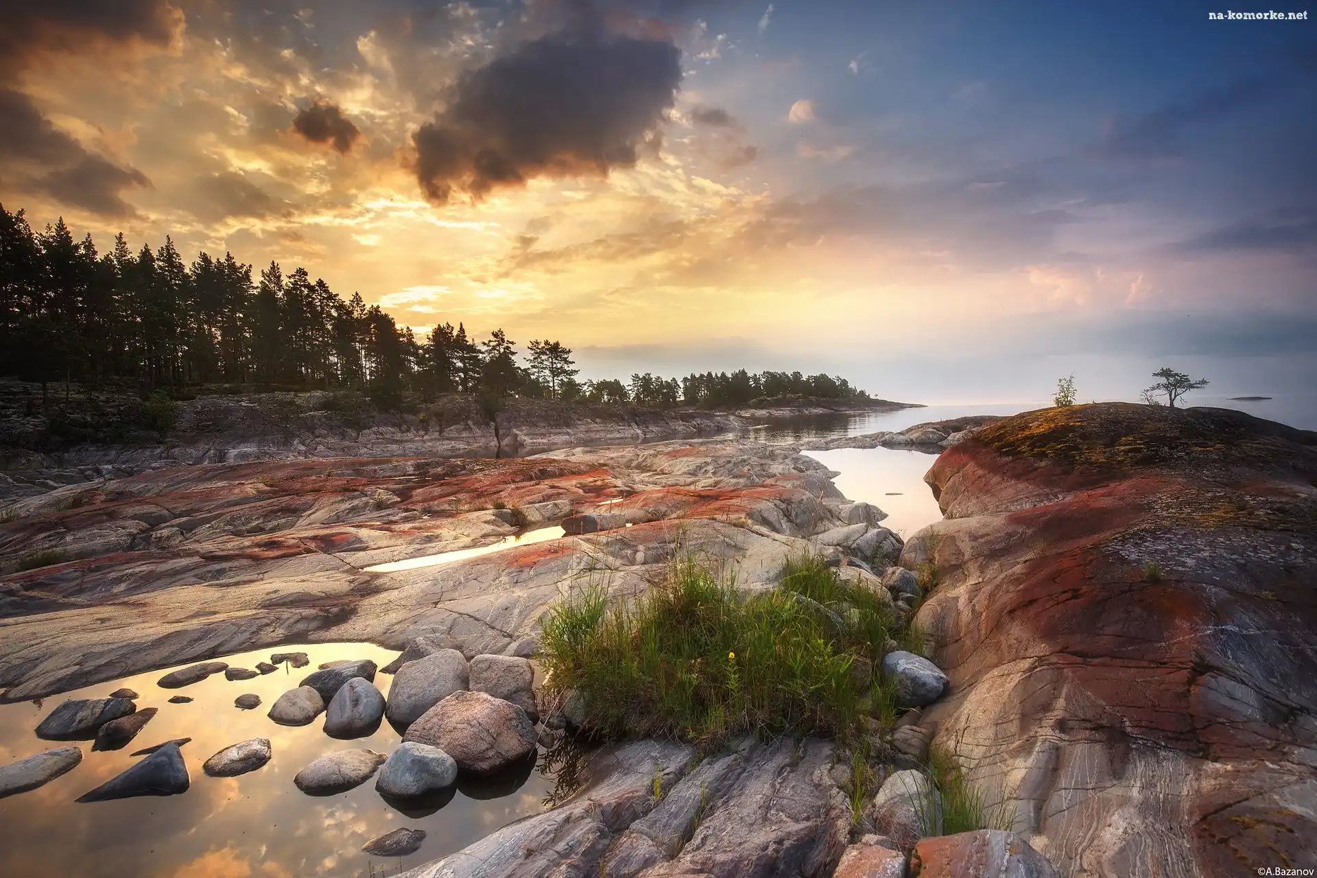 Obwód leningradzki, Rosja, Skały, Jezioro Ładoga, Wschód słońca, Karelia, Chmury, Kamienie, Drzewa na Komórkę |