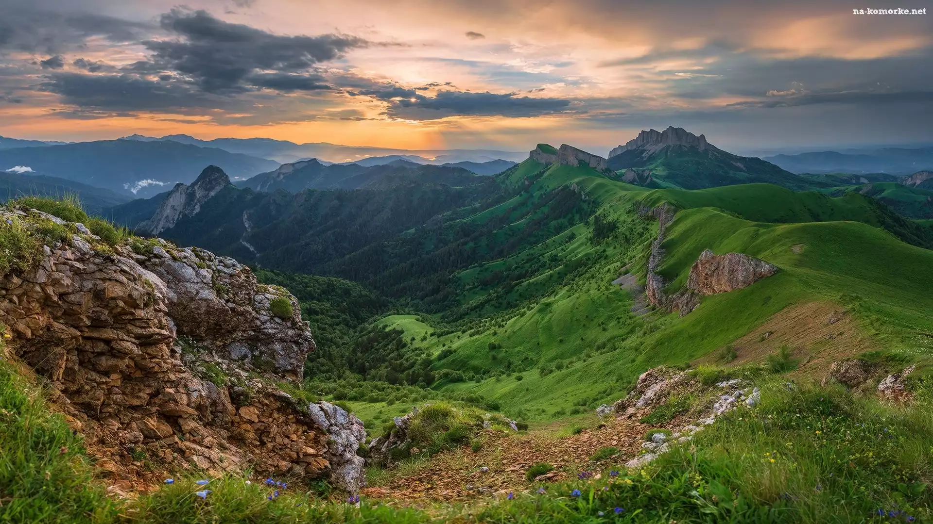 Góry, Adygeja, Rosja, Kaukaz, Dolina, Zachód słońca, Chmury na Komórkę