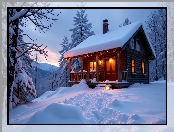 Śnieg, Drzewa, Dom, AI, Wzgórze, Zima, Oświetlony na Komórkę