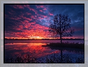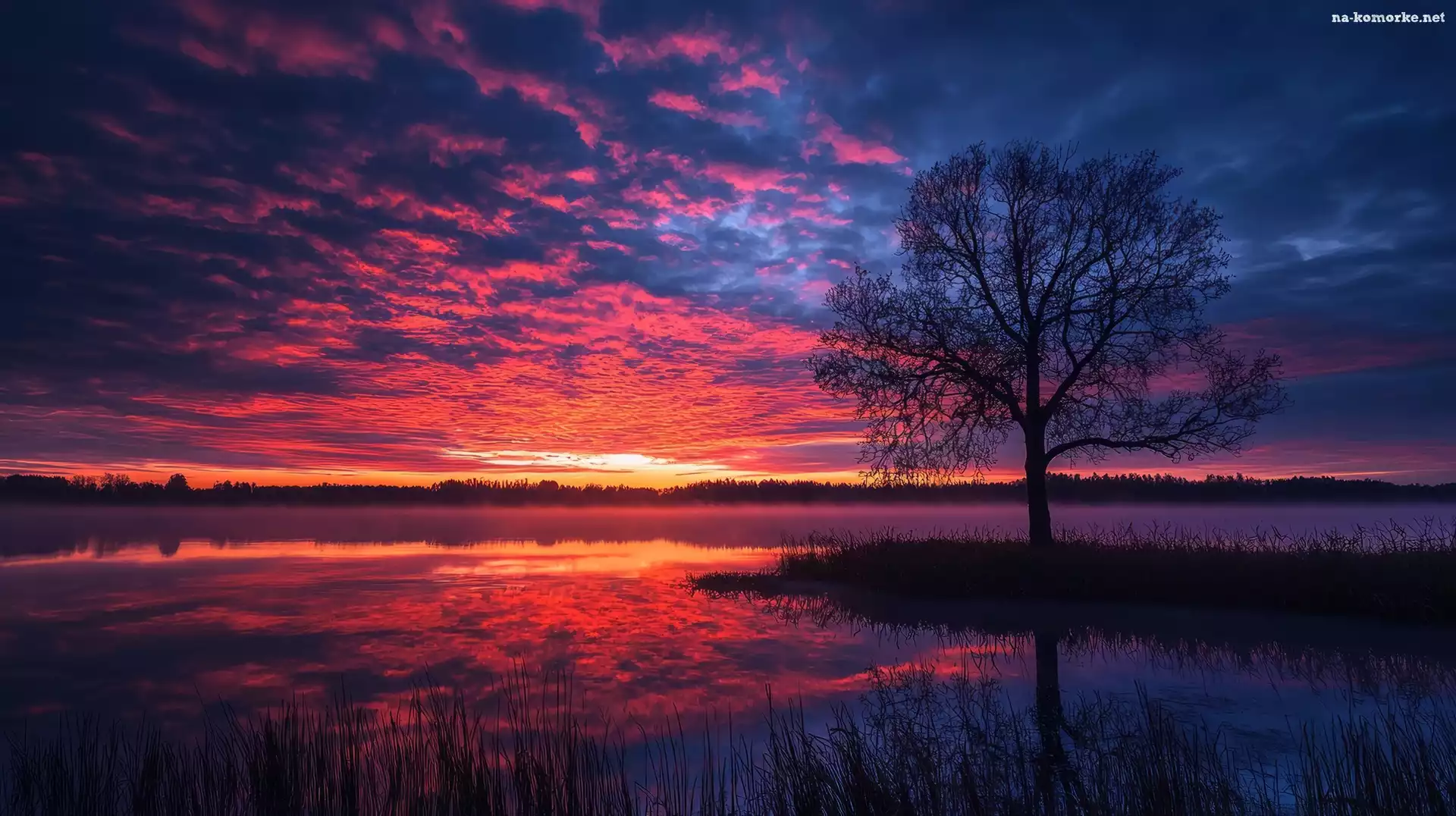 Zachód słońca, Grafika AI, Jezioro, Drzewo na Komórkę