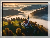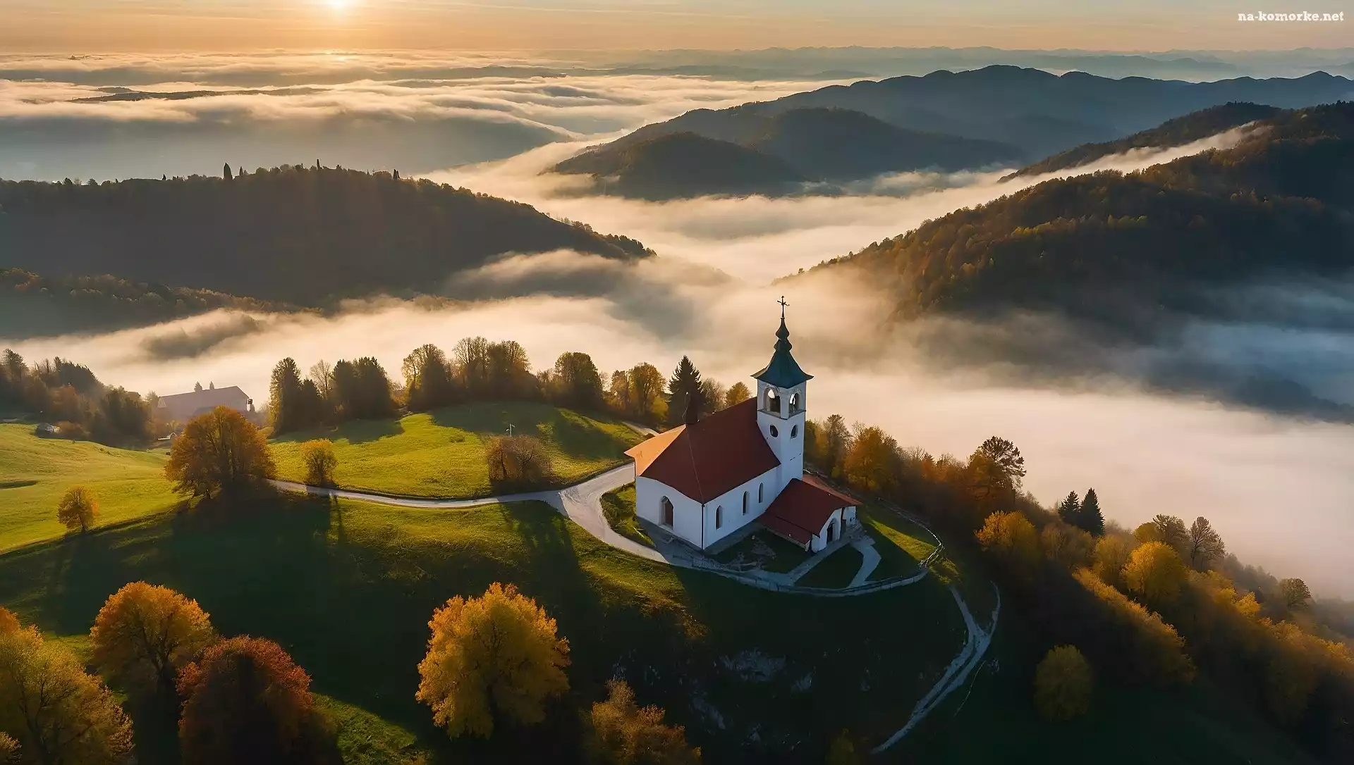Mgła, Drzewa, Góry, AI, Drzewa, Kościół, Jesień na Komórkę
