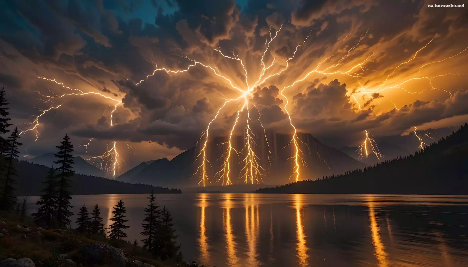 Drzewa, Jezioro, Grafika AI, Chmury, Pioruny, Burza na Komórkę