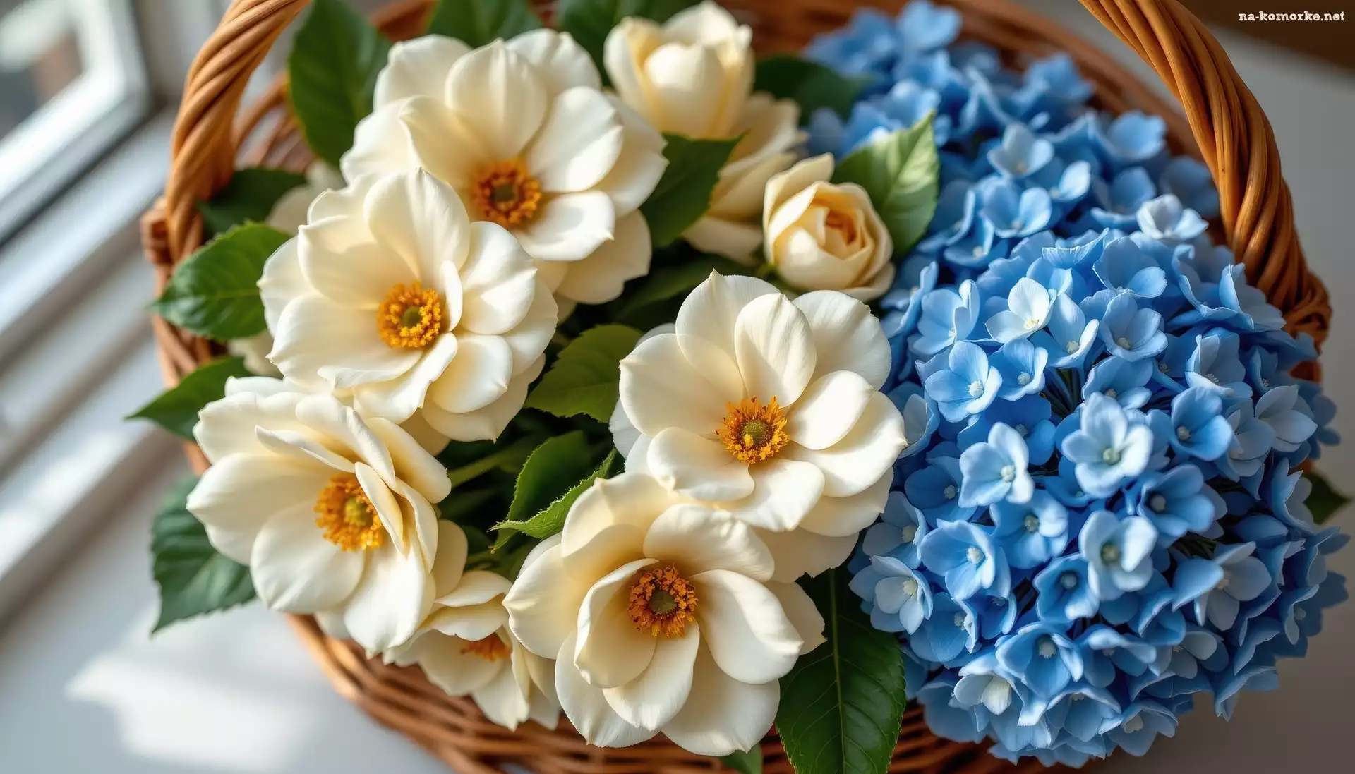 Koszyk, Kwiaty, Niebieskie, AI, Hortensje, Kamelie na Komórkę