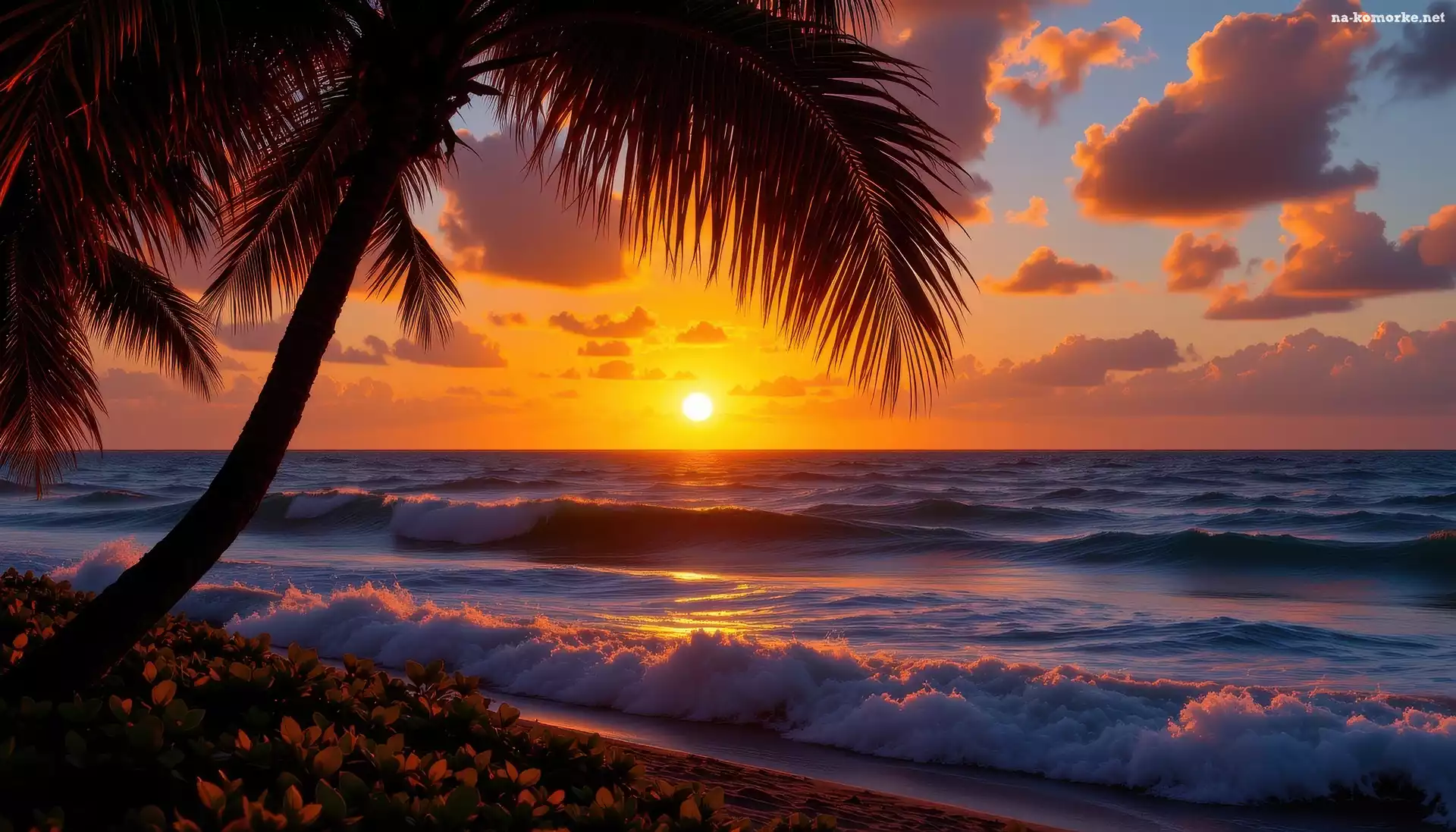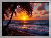Zachód słońca, Grafika AI, Palma, Morze na Komórkę