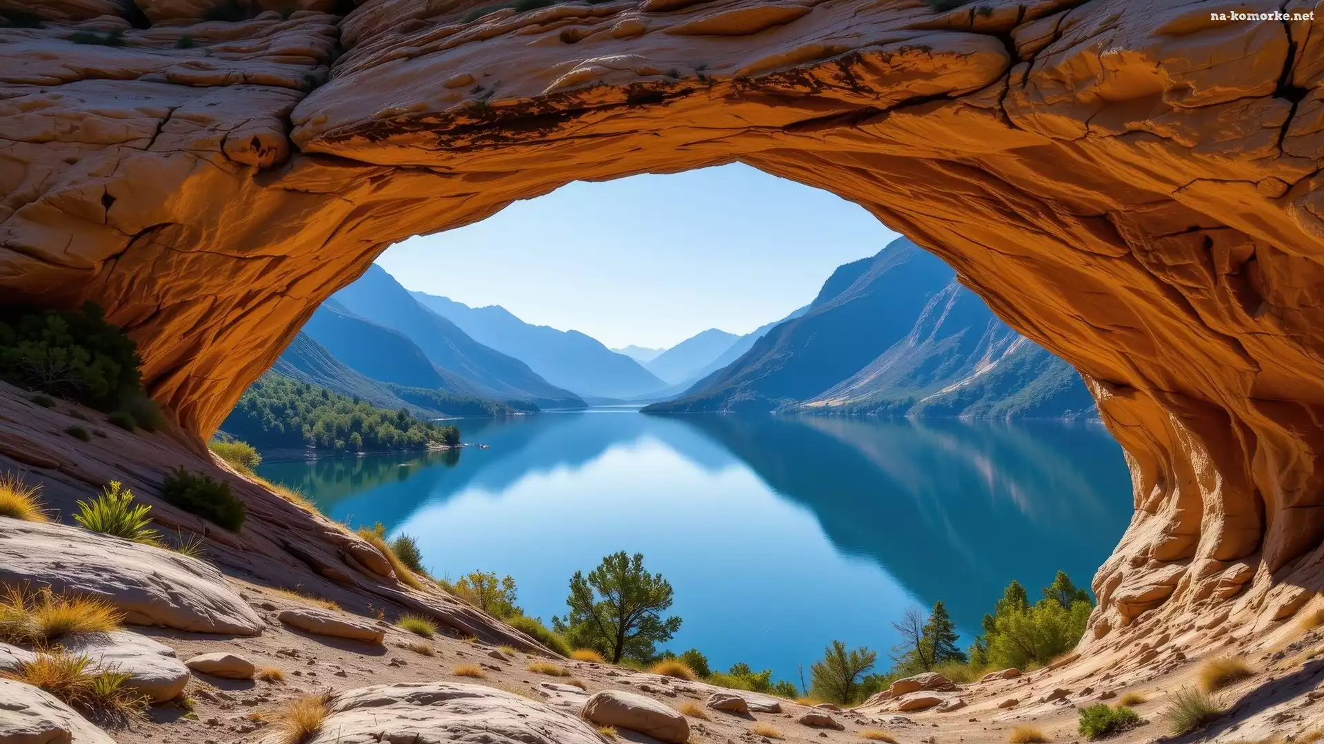 Góry, Drzewa, Skały, AI, Widok, Jezioro, Łuk na Komórkę