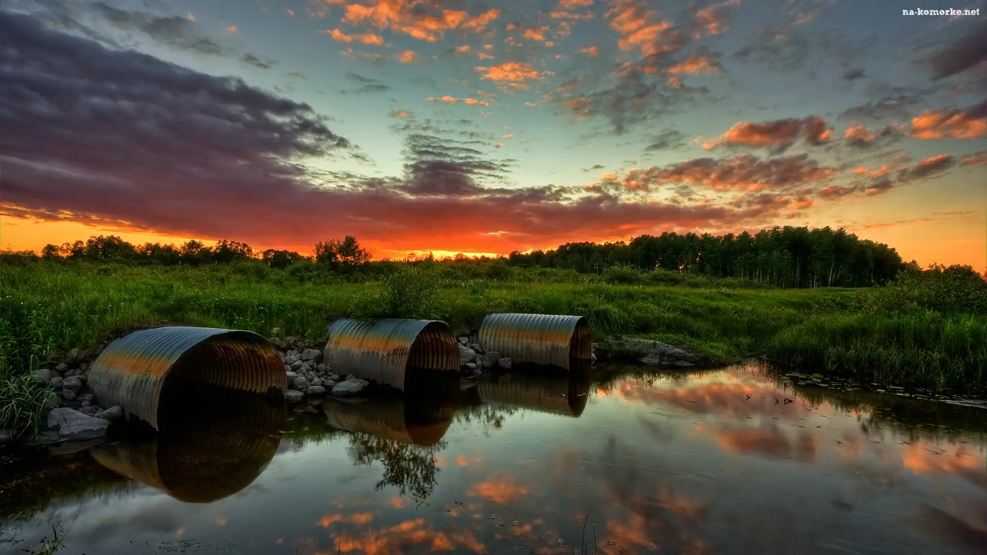 Łąka, Słońca, Zachód, Odbicie, Chmury, Jezioro na Komórkę