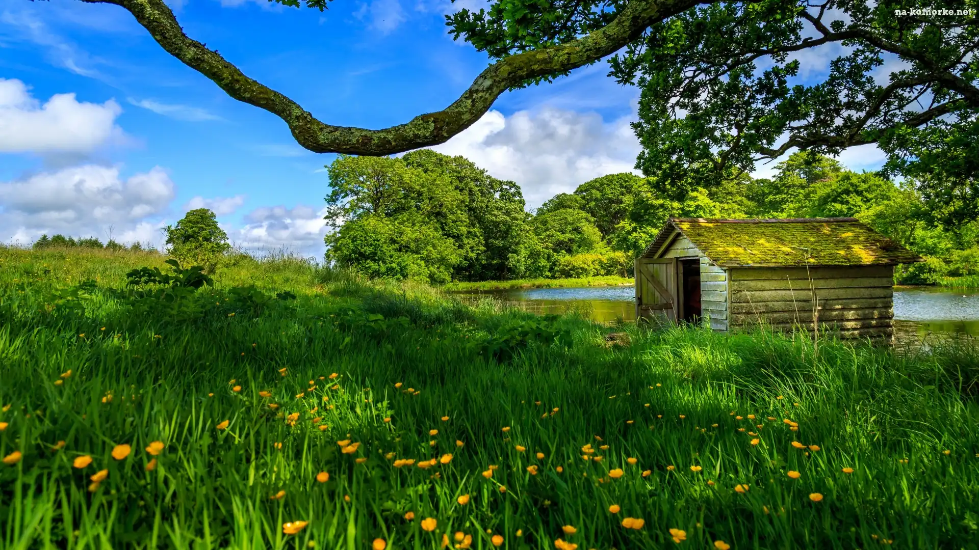 Łąka, Domek, Drewniany, Drzewa, Jezioro, Kwiaty na Komórkę