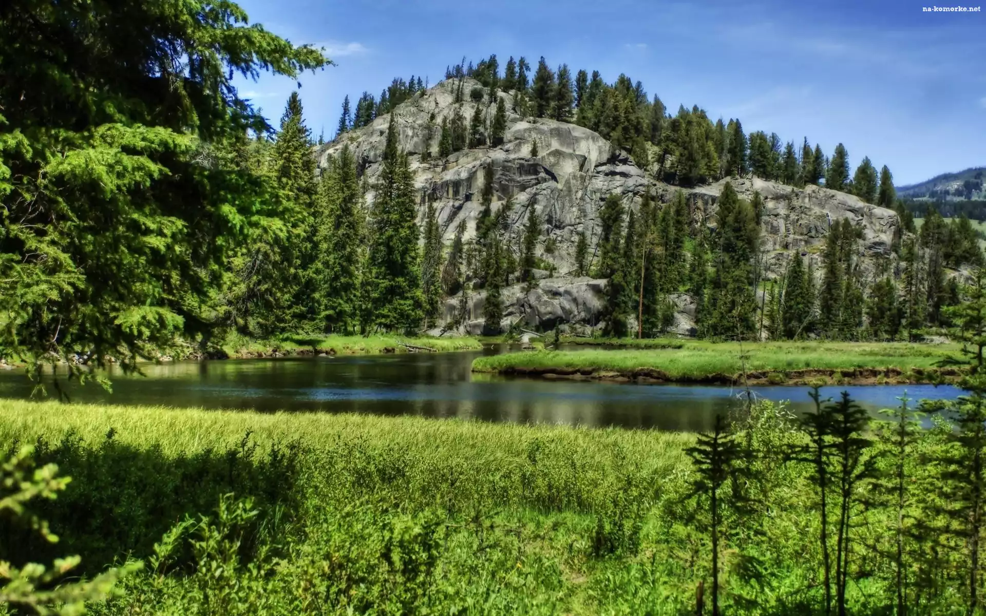Łąka, Rzeka, Skały, Cień, Las, Światło na Komórkę