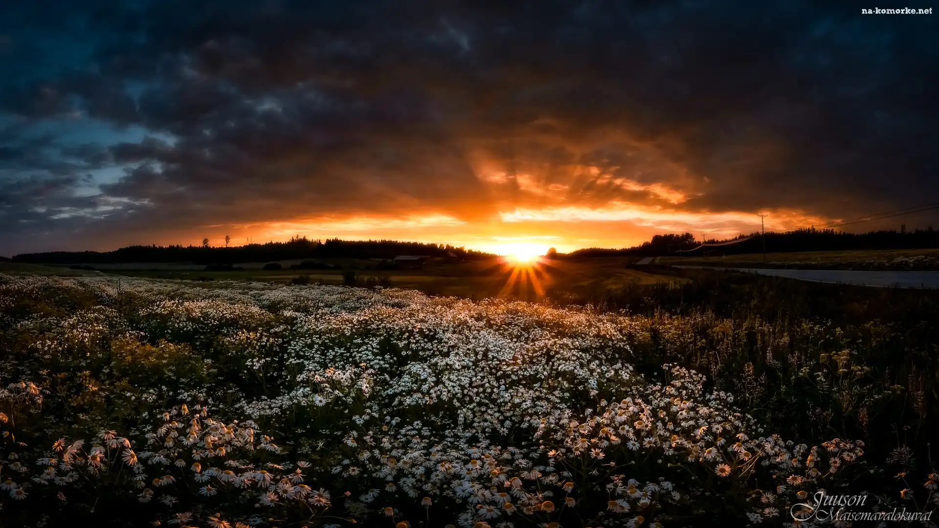 Łąka, Ciemne, Zachód słońca, Rumianek, Chmury, Kwiaty na Komórkę