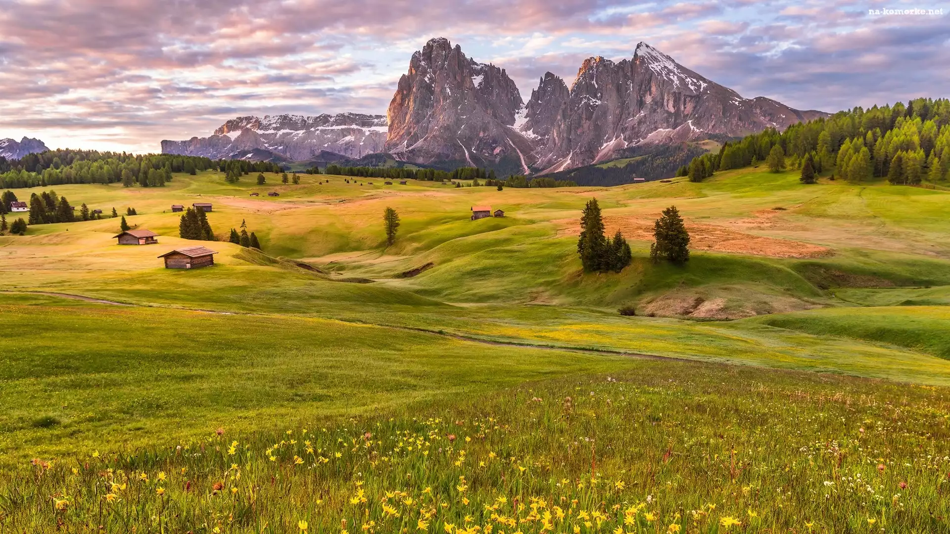 Dolomity, Dolina Val Gardena, Łąki, Płaskowyż Seiser Alm, Włochy, Góry Sassolungo, Chmury, Domki, Drzewa na Komórkę |