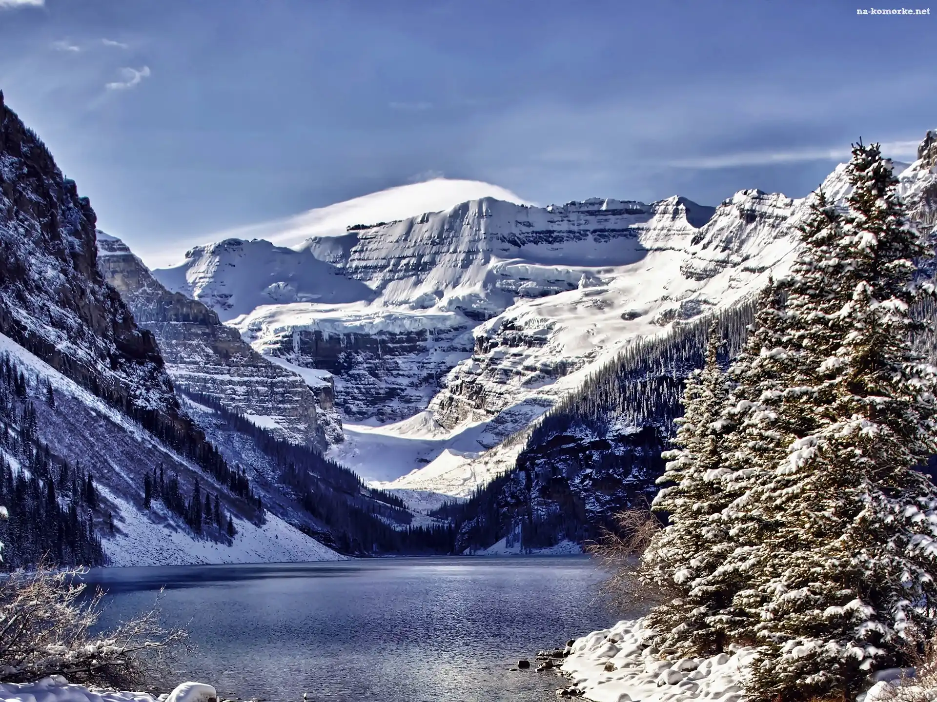 Zima, Prowincja Alberta, Kanada, Jezioro Lake Louise, Park Narodowy Banff, Góry na Komórkę