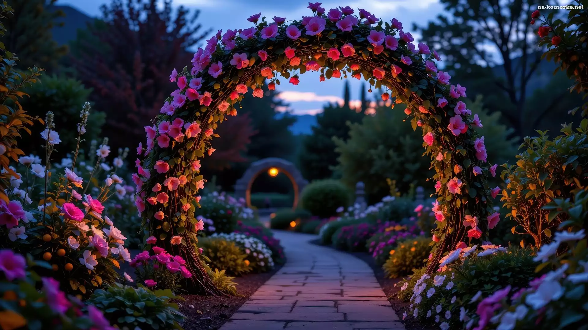Kwiaty, Drzewa, Ogród, Alejka, Łuk, Kolorowe, Kwiatowy na Komórkę