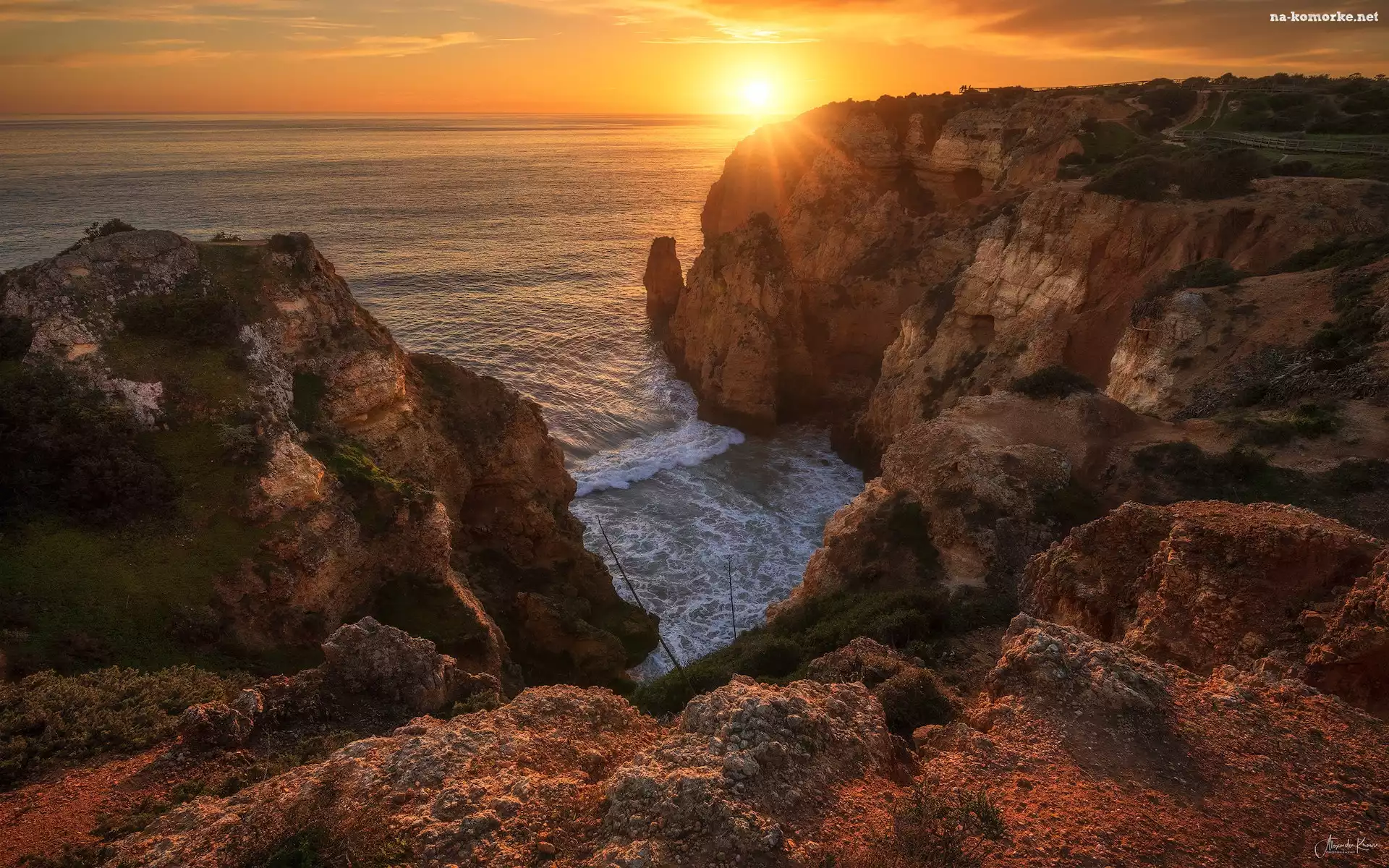 Portugalia, Skały, Morze, Algarve, Wschód słońca na Komórkę