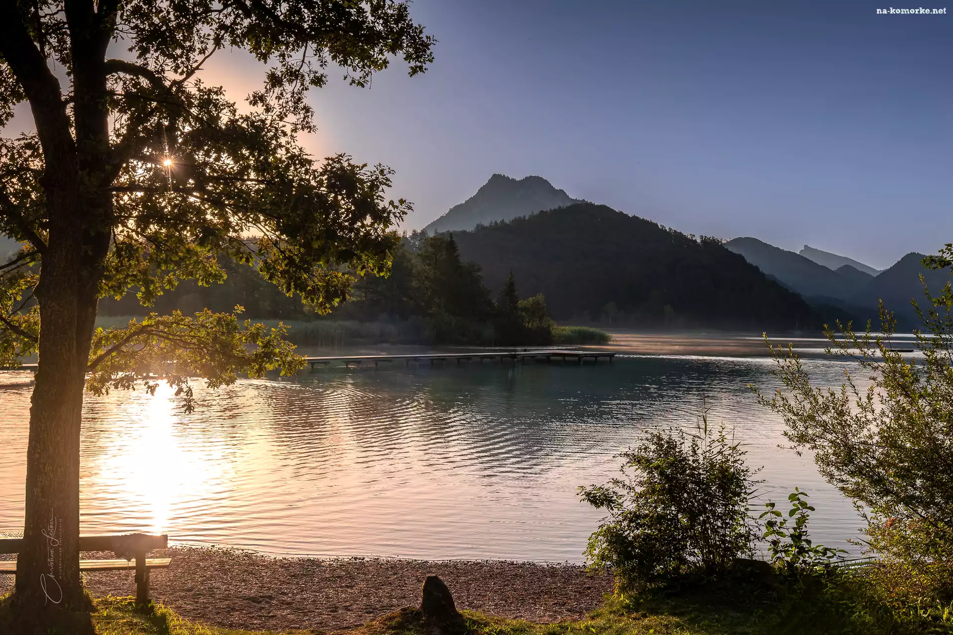 Ławka, Fuschlsee Lake, Wschód słońca, Jezioro, Alpy, Góry, Austria, Drzewo, Krzewy na Komórkę