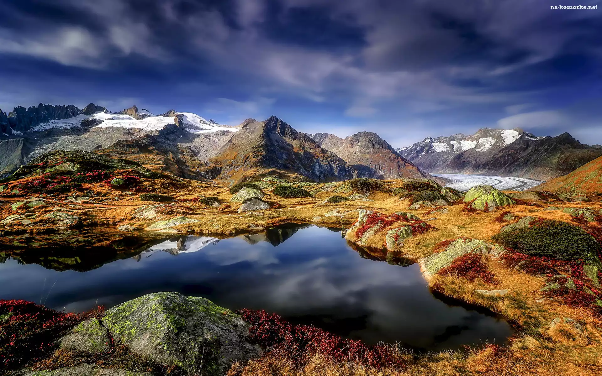 Alpy Berneńskie, Niebo, Aletschgletscher, Szwajcaria, Jezioro Marjelensee, Chmury, Lodowiec, Góry na Komórkę |