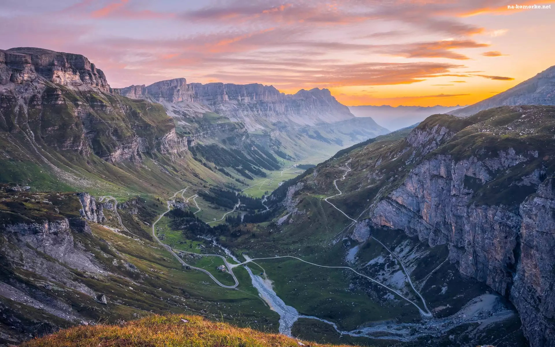 Alpy Glarneńskie, Wschód słońca, Klausenpass, Szwajcaria, Drzewa, Chmury, Przełęcz, Góry na Komórkę