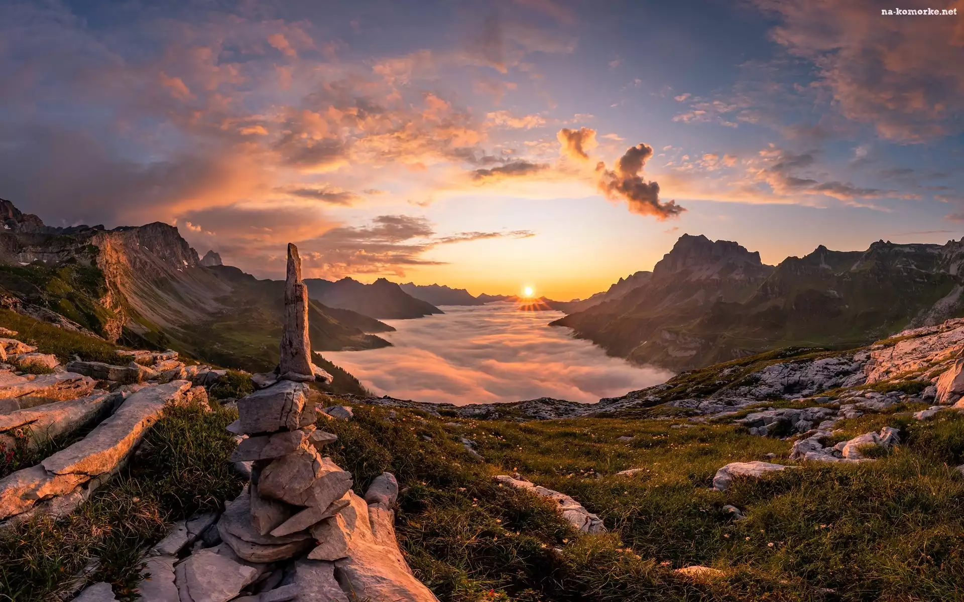Alpy Glarneńskie, Zachód słońca, Klausenpass, Szwajcaria, Mgła, Chmury, Przełęcz, Góry na Komórkę