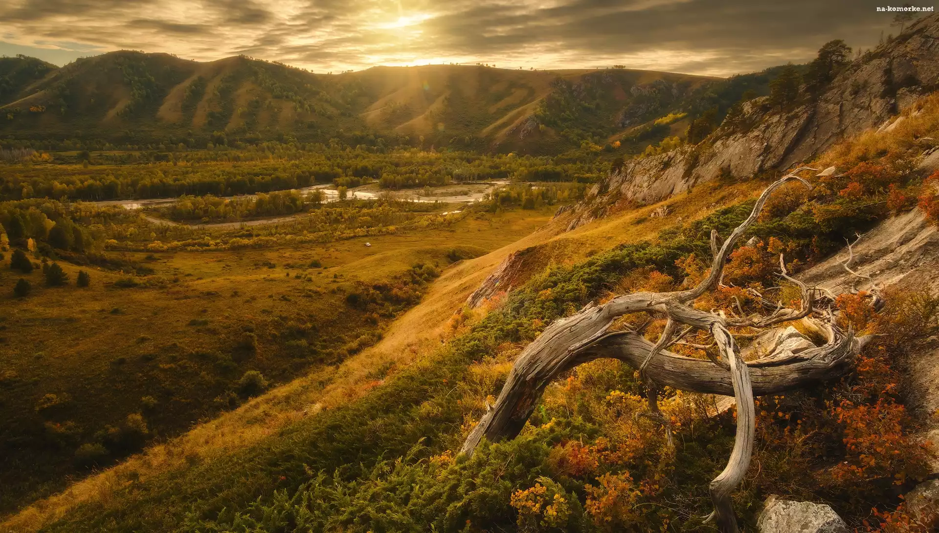Zachód słońca, Syberia, Rosja, Góry, Rzeka, Rezerwat Tigirek, Ałtaj na Komórkę