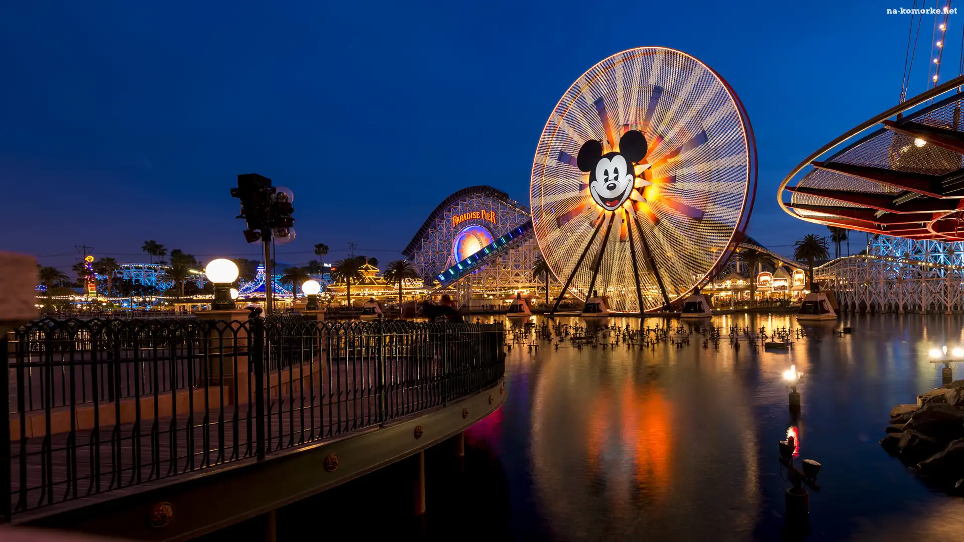 Anaheim, Stany Zjednoczone, Karuzele, Park rozrywki, Noc, Kalifornia, Rzeka, Disney California Adventure Park, Diabelski młyn na Komórkę |