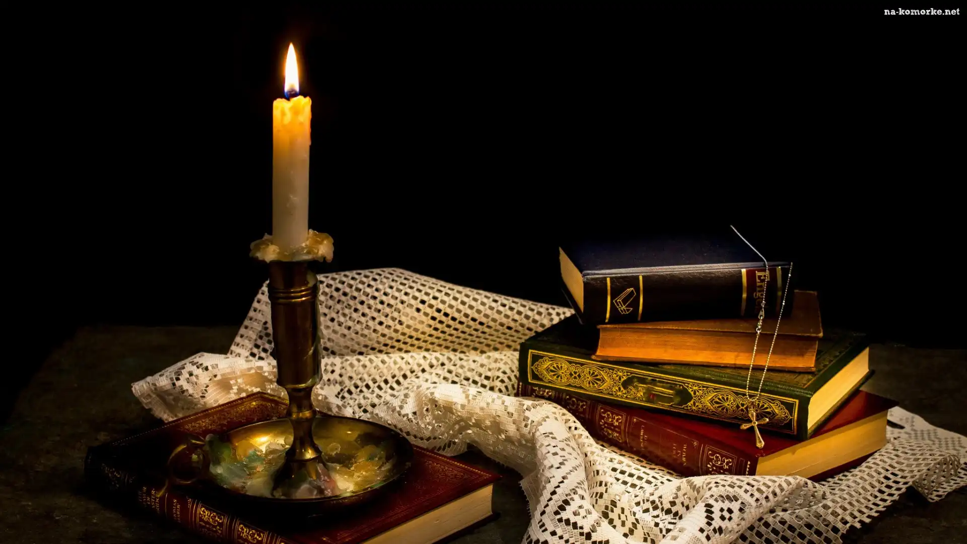 Kompozycja, Łańcuszek, Medalik, Książki, Świecznik, Świeca, Serweta na Komórkę