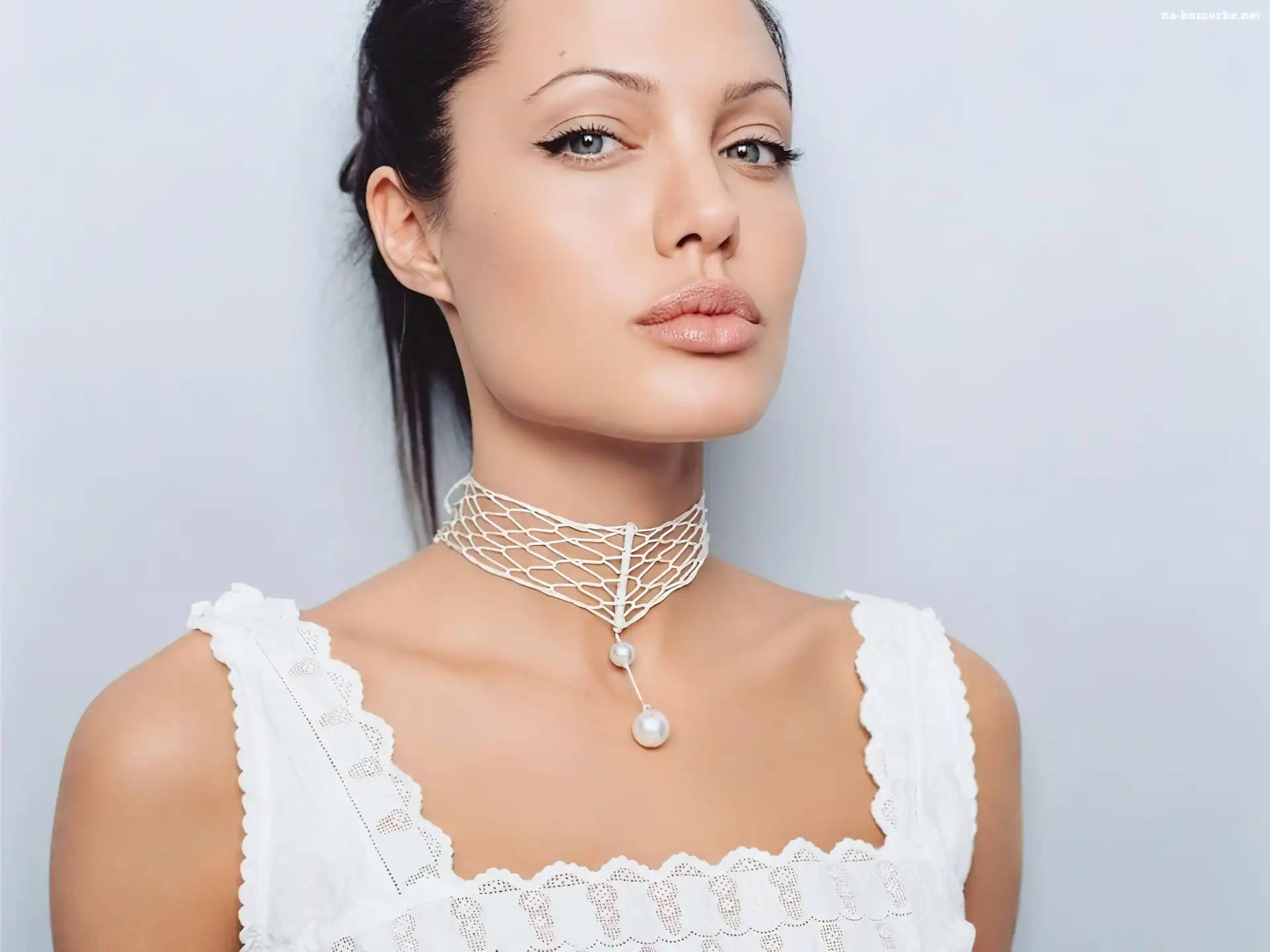 Angelina Jolie, biały top, naszyjnik na Komórkę