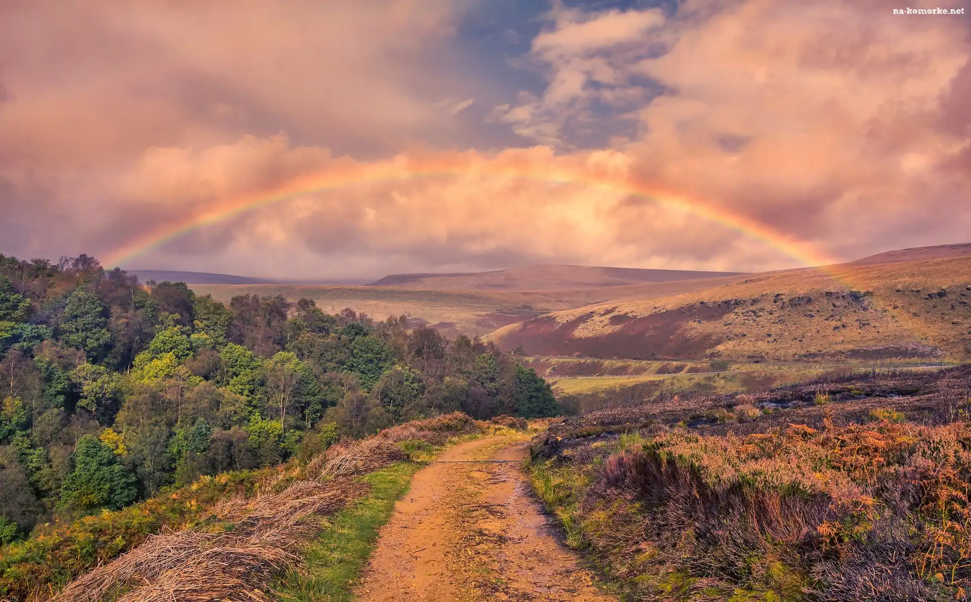 Park Narodowy Peak District, Anglia, Tęcza, Dolina Longdendale, Drzewa, Hrabstwo Derbyshire, Las, Wzgórza, Droga na Komórkę |