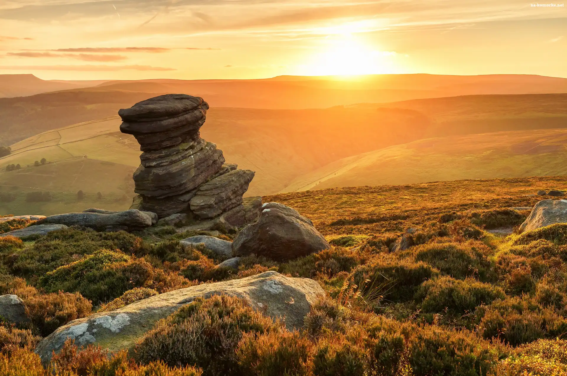 Anglia, Pola, Park Narodowy Peak District, Zachód słońca, Hrabstwo Derbyshire, Formacja skalna Salt Cellar, Wzgórza, Kamienie na Komórkę |