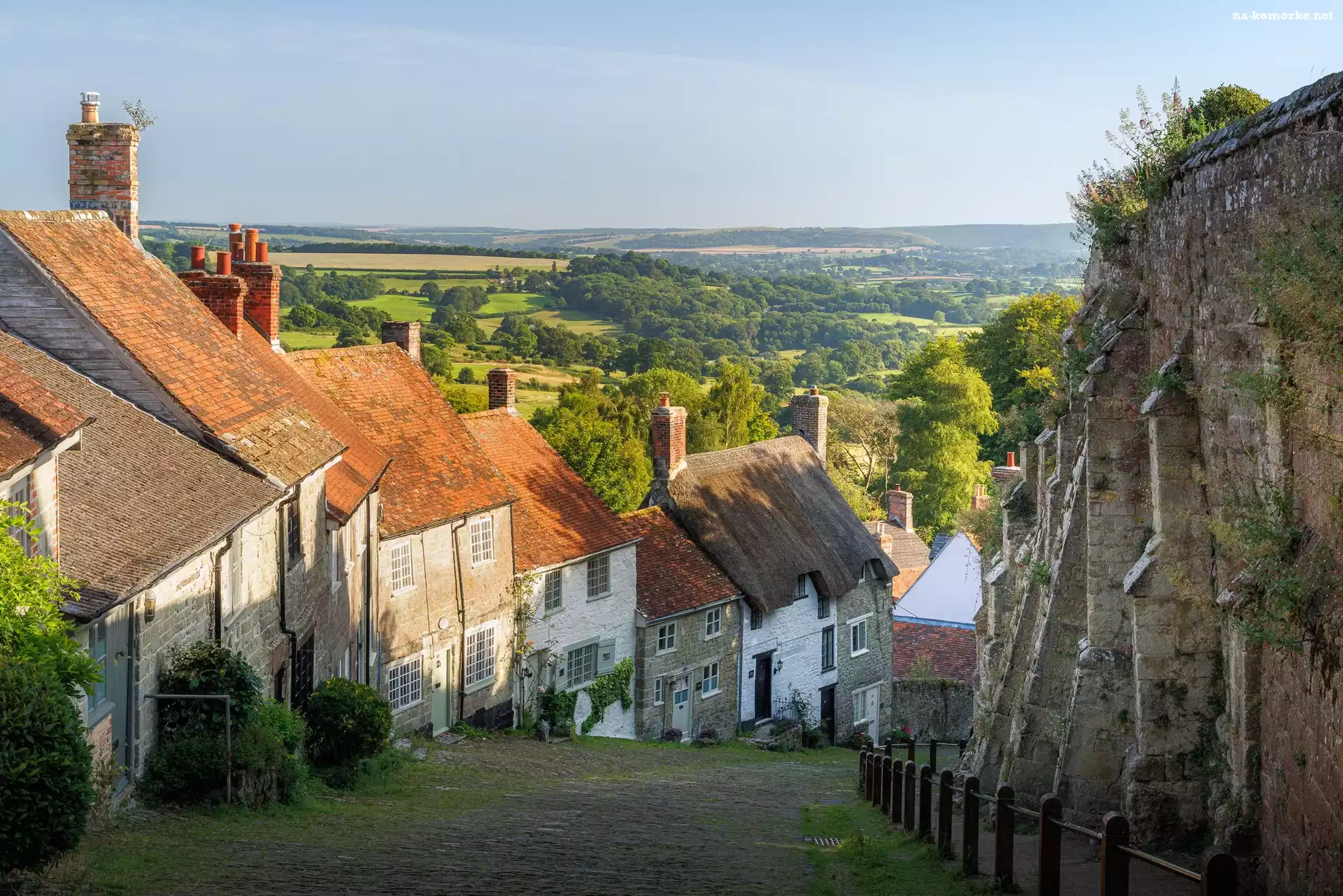 Mur, Ulica, Zachód Słońca, Gold Hill, Złote Wzgórze, Shaftesbury, Anglia, Domy, Drzewa na Komórkę