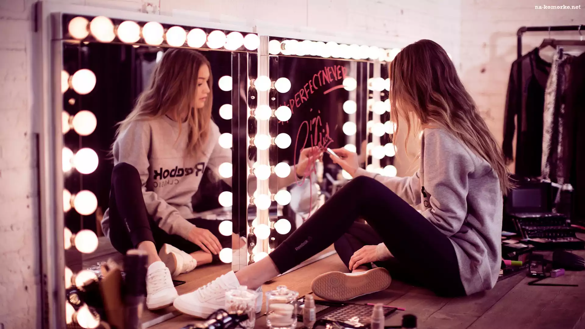 Kobieta, Szminki, Modelka, Kosmetyki, Gigi Hadid, Trampki, Lustro, Żarówki na Komórkę