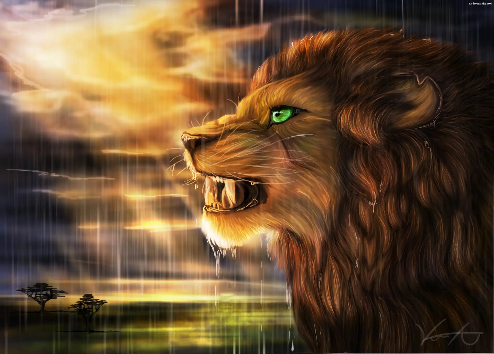 Art, Lew, Zachód, Słońca, Deszcz na Komórkę