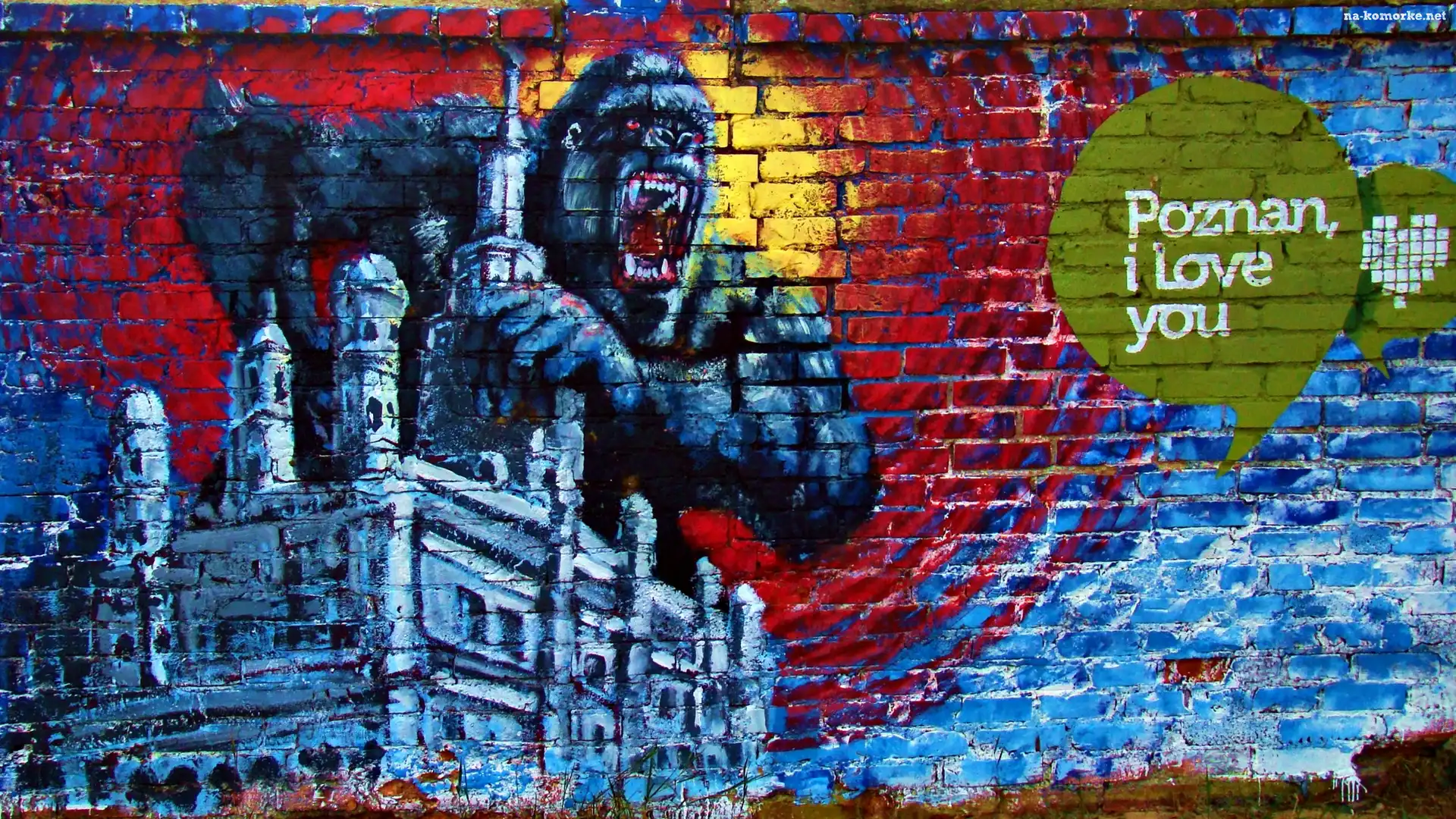 Street art, Mural, Ściana, King Kong, Napis na Komórkę