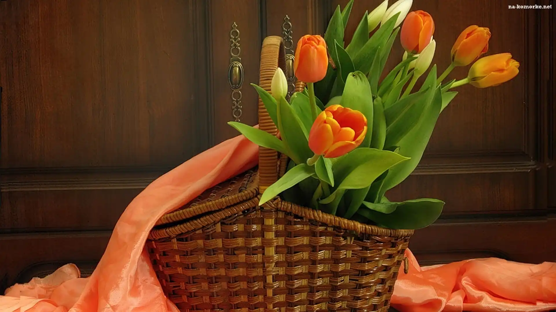 Atłas, Wiklinowy, Kosz, Pomarańczowe, Tulipany na Komórkę