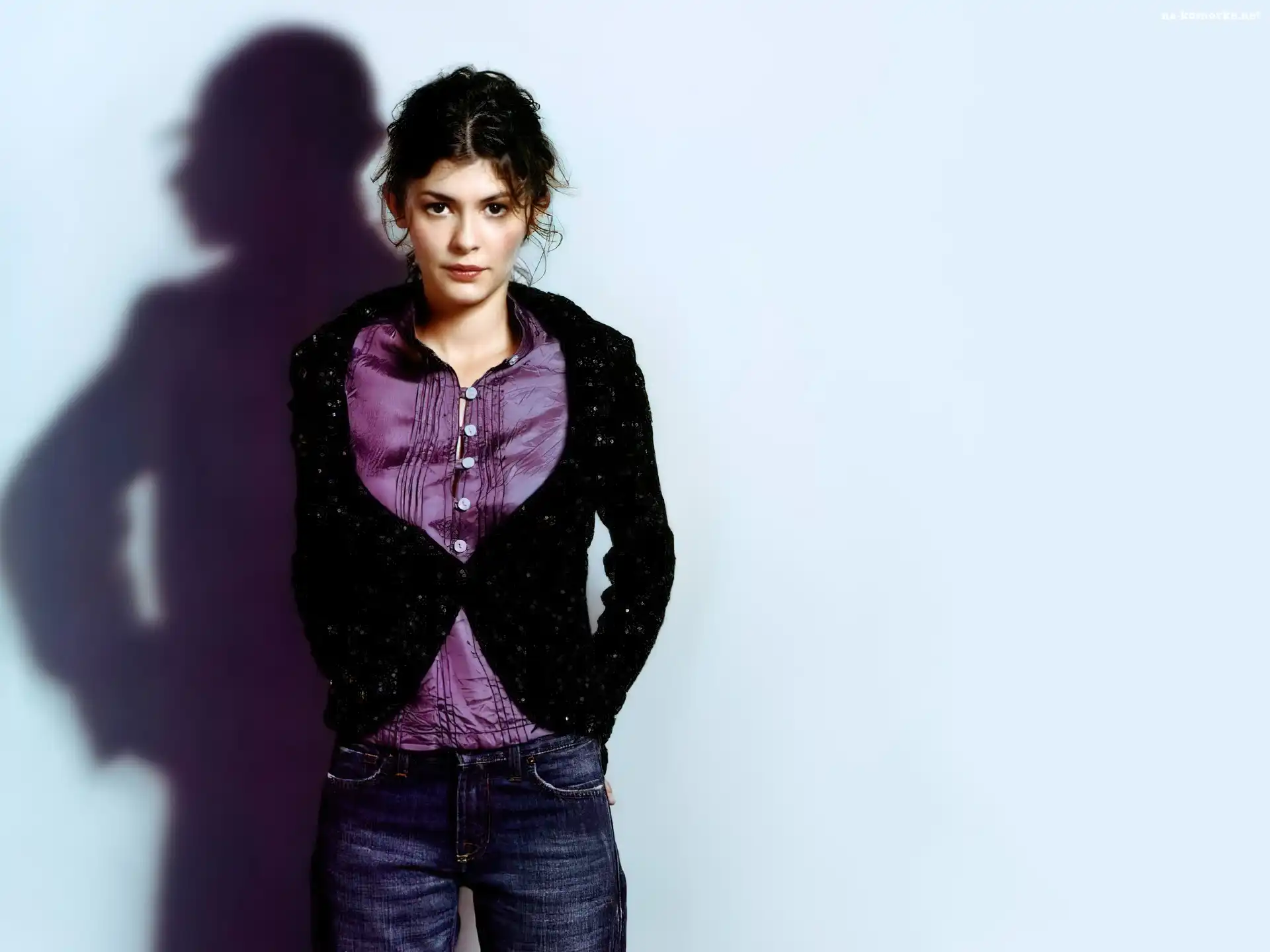 Audrey Tautou, jeansy, fioletowa koszula na Komórkę