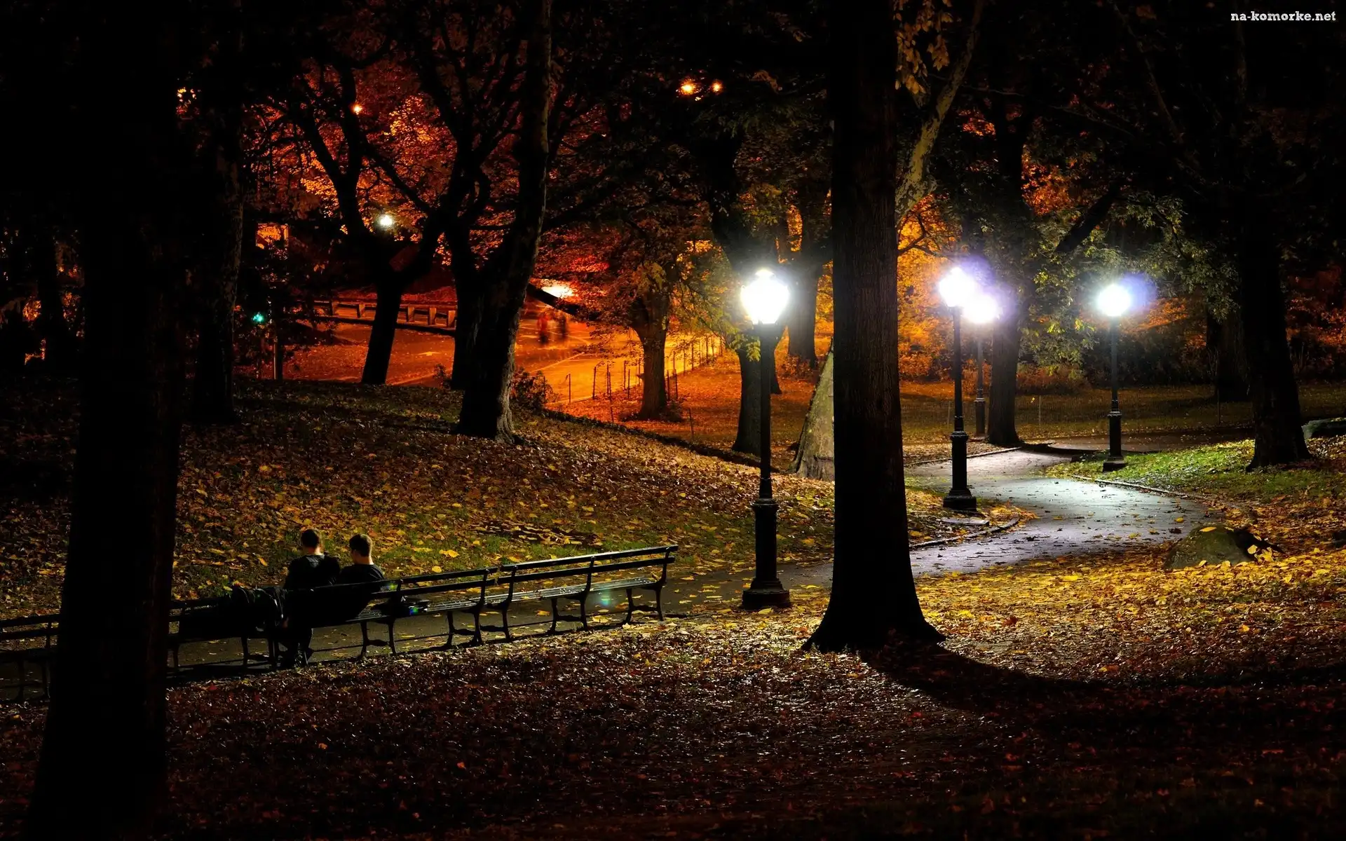 Ławka, Park, Jesień, Noc, Drzewa, Latarnie na Komórkę