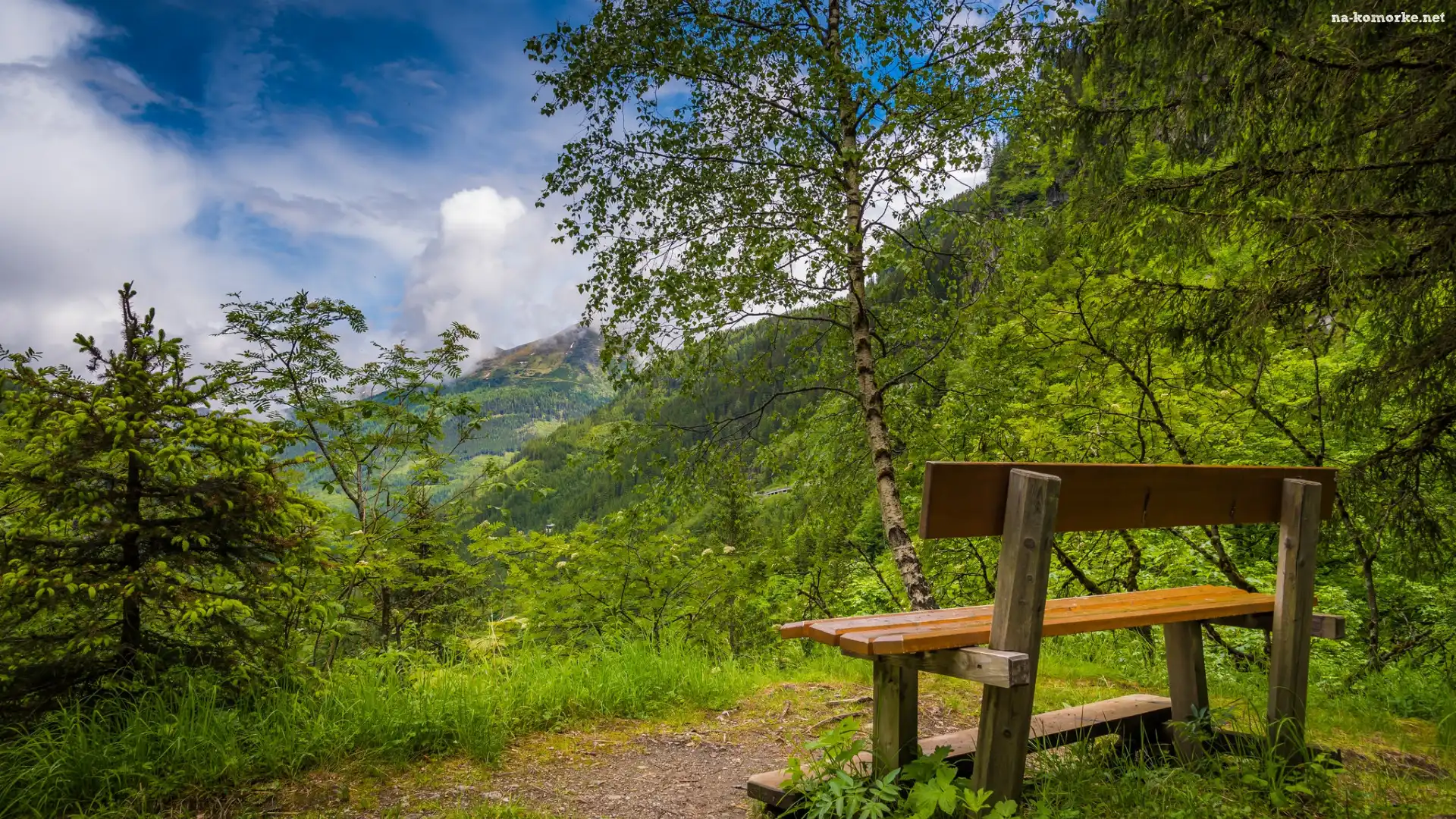 Ławka, Drzewa, Las, Chmury, Zieleń, Niebo na Komórkę