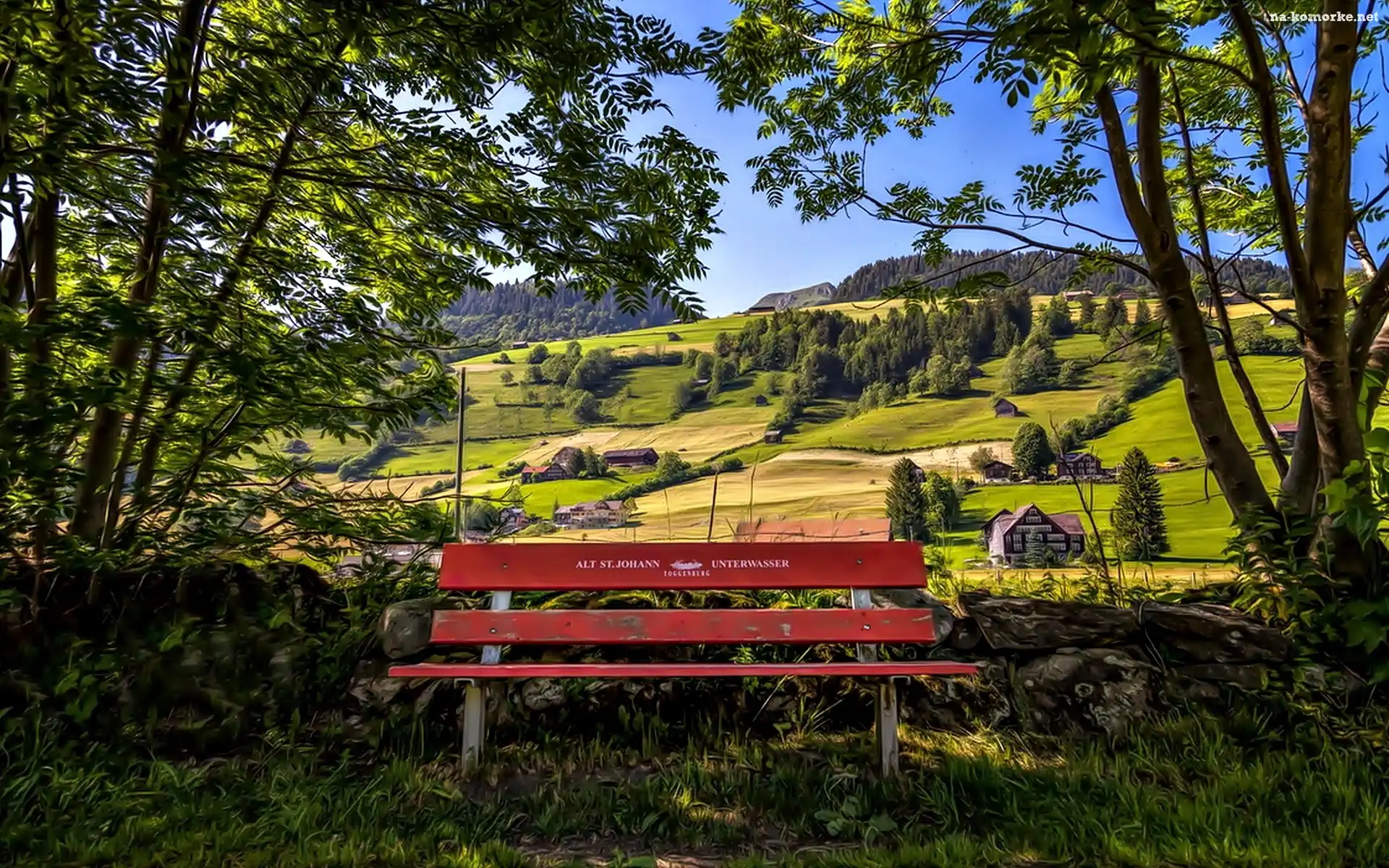 Ławka, Drzewa, Łąka, Wzgórza, Domek, Park na Komórkę